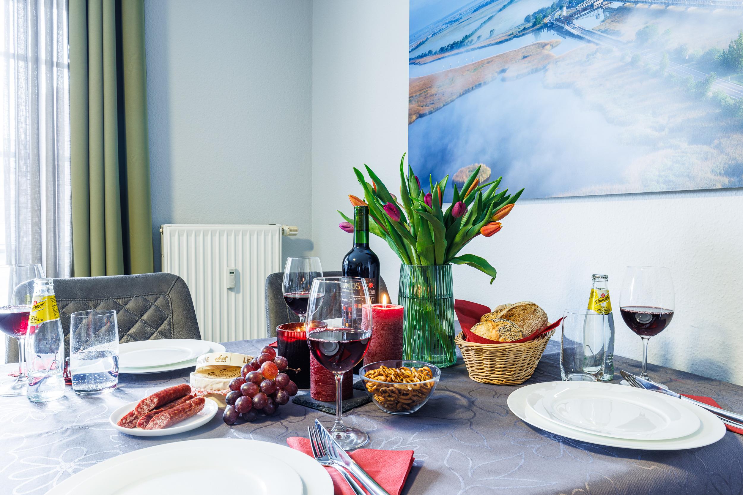 Die Nichtraucherwohnung befindet sich im ersten Obergeschoss und verfügt über zwei Balkone mit stilvollen Gartenmöbeln, die ideal für entspannte Stunden im Freien sind. Ein Pkw-Stellplatz sowie ein Fahrradraum stehen Ihnen ebenfalls zur Verfügung.