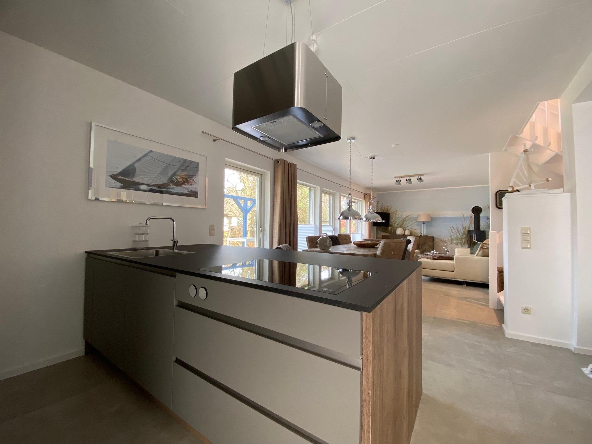 Ihr luxoriöses neu saniertes Ferienhaus verfügt im Erdgeschoß über eine offene, luxoriöse komplett eingerichtete Küche mit Kochinsel, großes Induktionsfeld, Backofen, Geschirrspüler und großer Kühlschrank, Gefrierschrank, Nespressomaschine, Kaffeemaschine, Toaster, Mikrowelle, Mixer, Wasserkocher, sehr hochwertiges Geschirr und Küchenutensilien.
