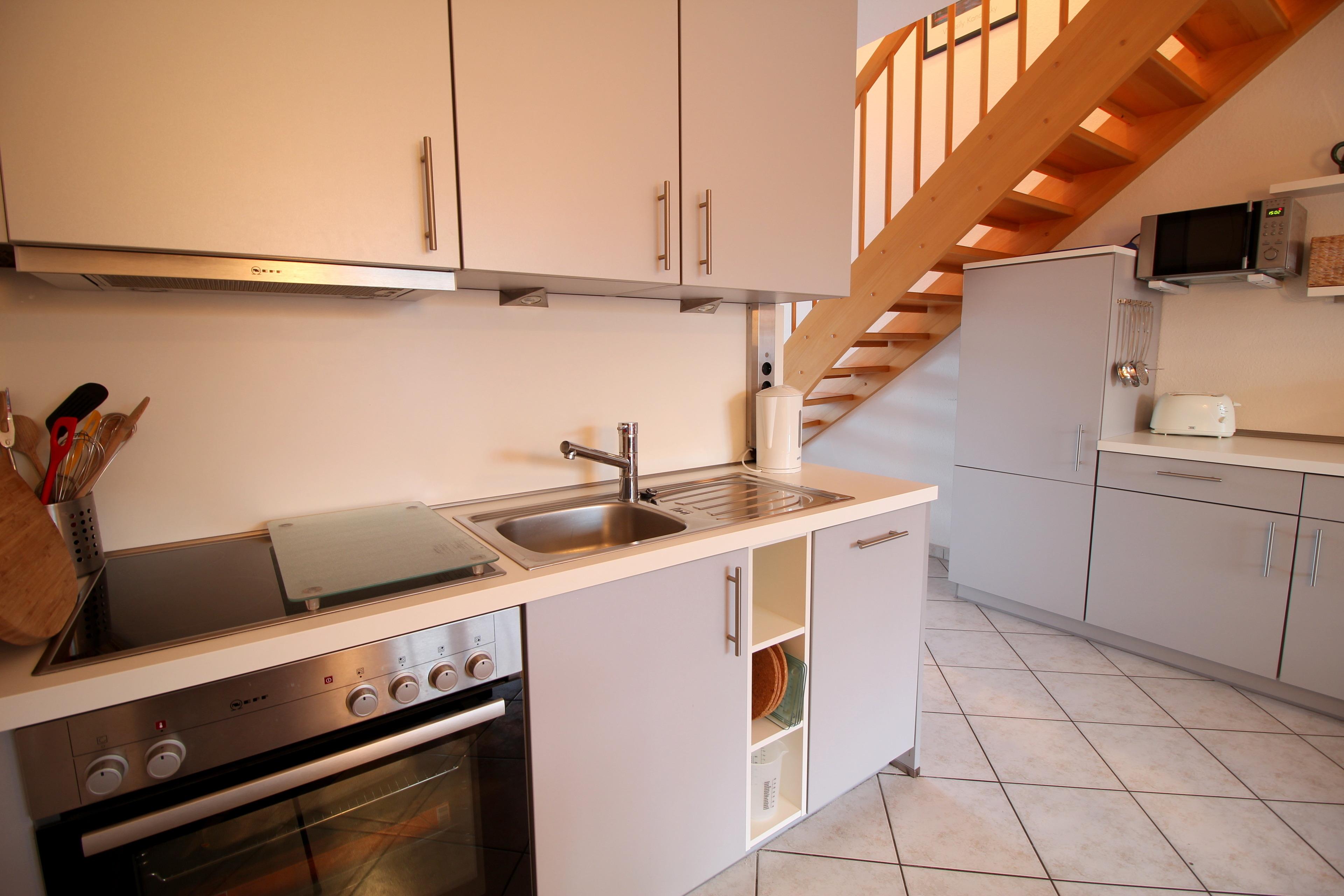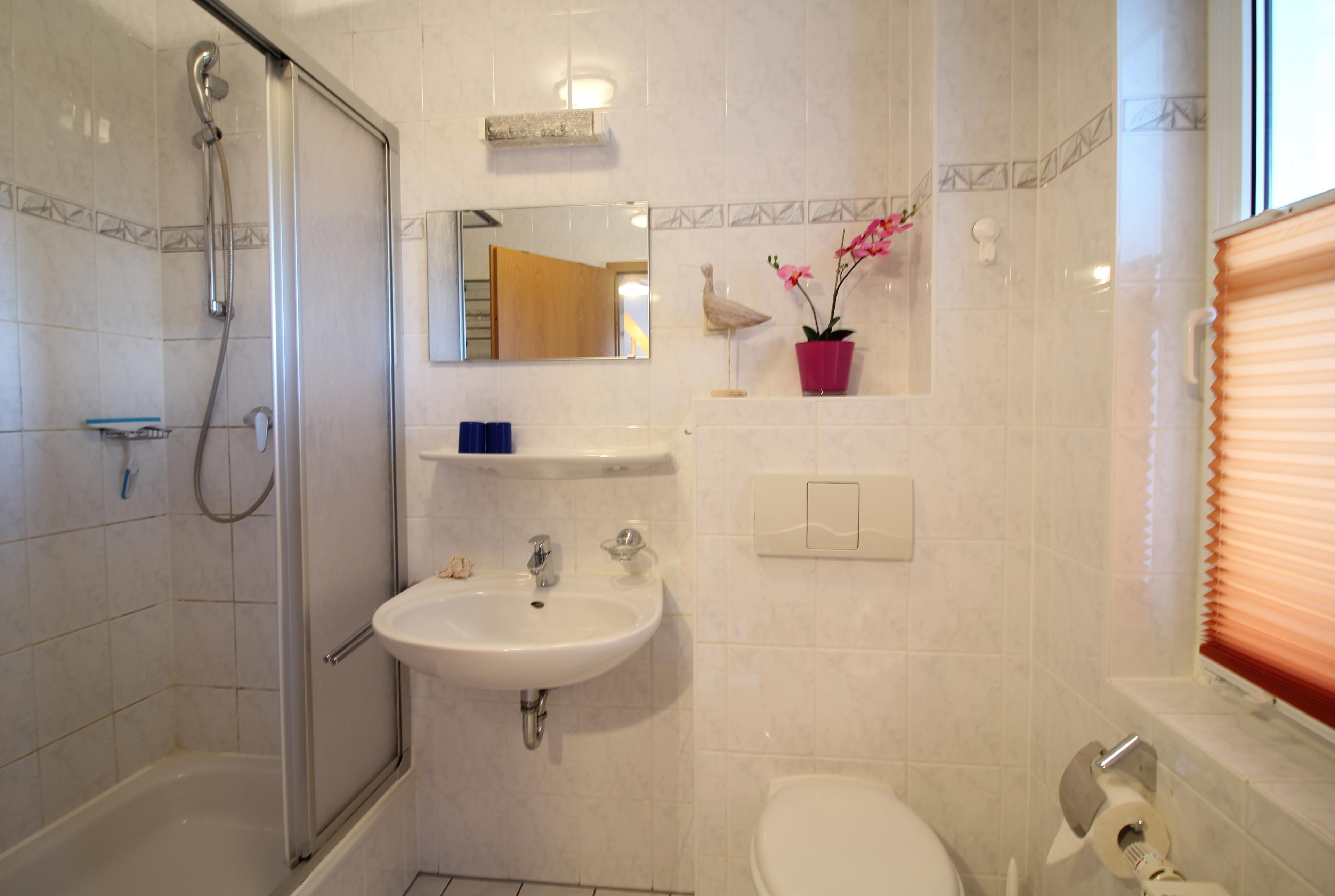 Die 3-Raum-Ferienwohnung bietet auf ca.55qm ausreichend Platz für 4 Personen + Kleinkind.In dem gemütlich eingerichtetem Wohnzimmer stehen Ihnen ein TV zur Verfügung.Von hier haben Sie einen direkten Zugang zur sonnigen Süd-Terrasse mit bequemen Gartenmöbeln,wo Sie einen schönen Strandtag ausklingen lassen können.Auf gleicher Ebene befindet sich die offene Küche.Im EG befindlichem Duschbad mit Tageslicht. Im OG befinden sich zwei Schlafzimmer.