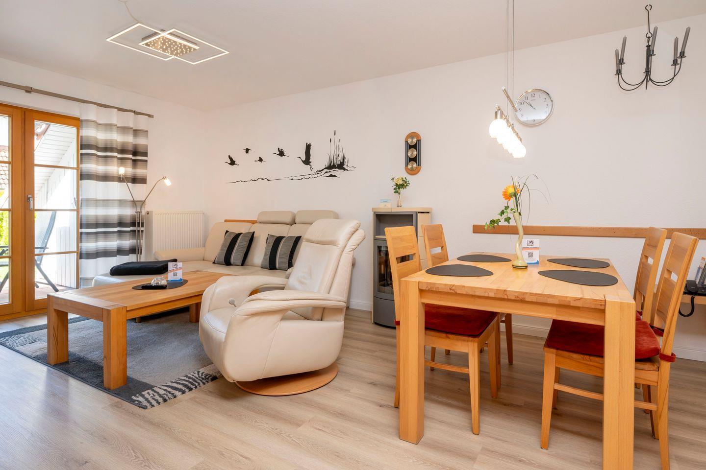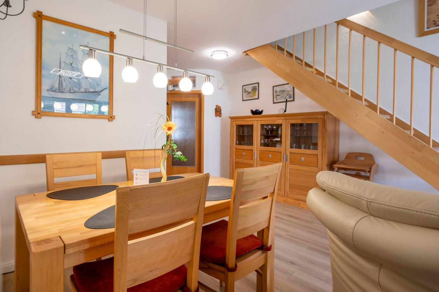 Im Erdgeschoss erwartet Sie ein stilvoller Wohnbereich mit gemütlicher Sitzgruppe, Ethanolkamin für stimmungsvolle Abende, Flachbild-TV und Blu-ray-Recorder. Am Esstisch finden bis zu vier Personen bequem Platz. Die angrenzende Küche ist voll ausgestattet mit Induktionsherd, Backofen, Mikrowelle, Kühlschrank mit Gefrierfach, Dunstabzugshaube und Geschirrspüler – ideal für Selbstversorger.