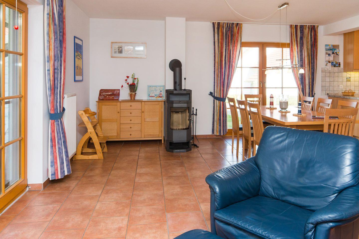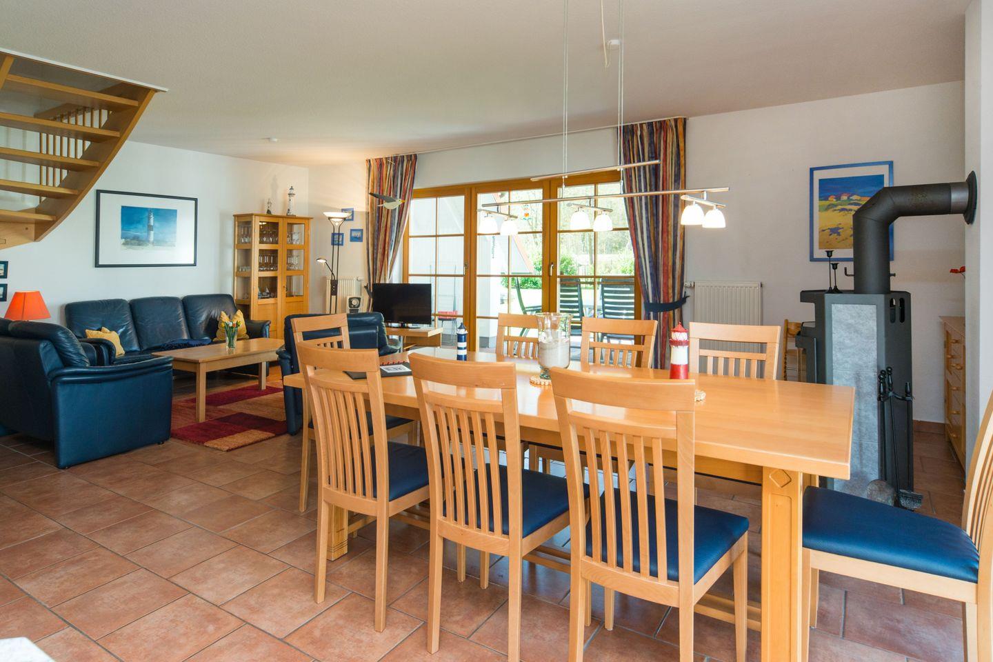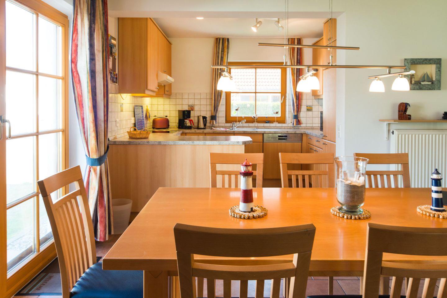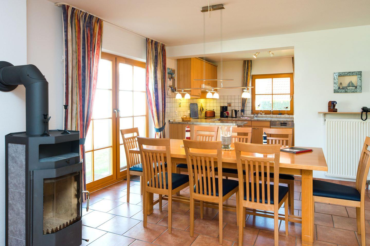 Im Erdgeschoss erwartet Sie ein einladender Wohnbereich mit gemütlicher Sitzgruppe, Flachbild-TV, DVD-Player und Kamin, der an kühleren Tagen für eine wohlige Atmosphäre sorgt. Am großen Esstisch können bis zu sechs Personen gemeinsam essen oder spielen. Die angrenzende Küche ist komplett ausgestattet mit Herd, Backofen, Mikrowelle, Kühlschrank mit Gefrierfach, Dunstabzugshaube und Geschirrspüler – ideal für einen flexiblen Aufenthalt.