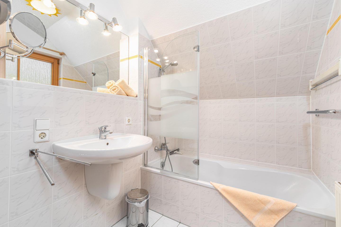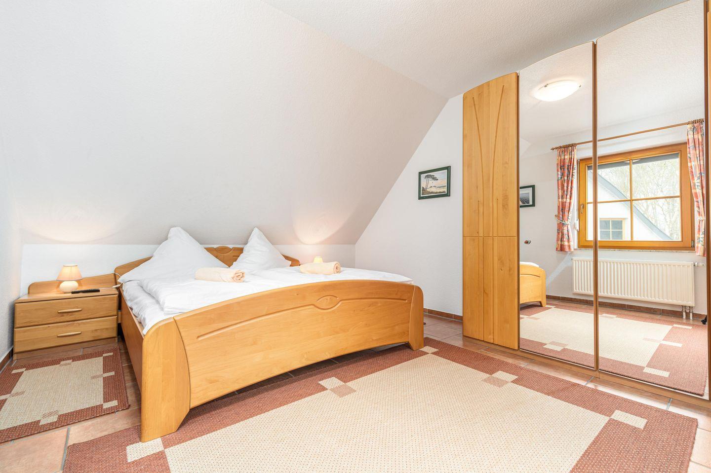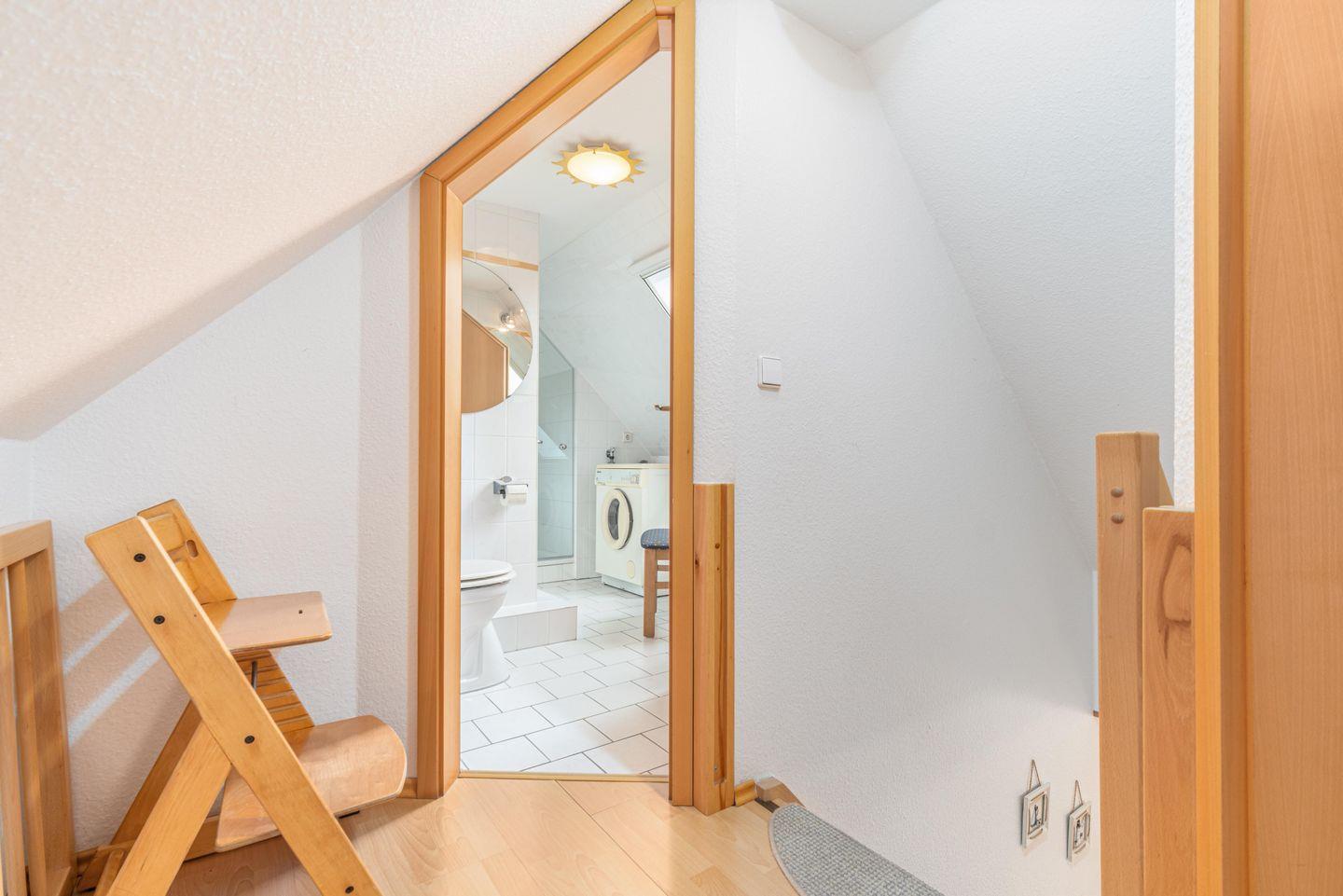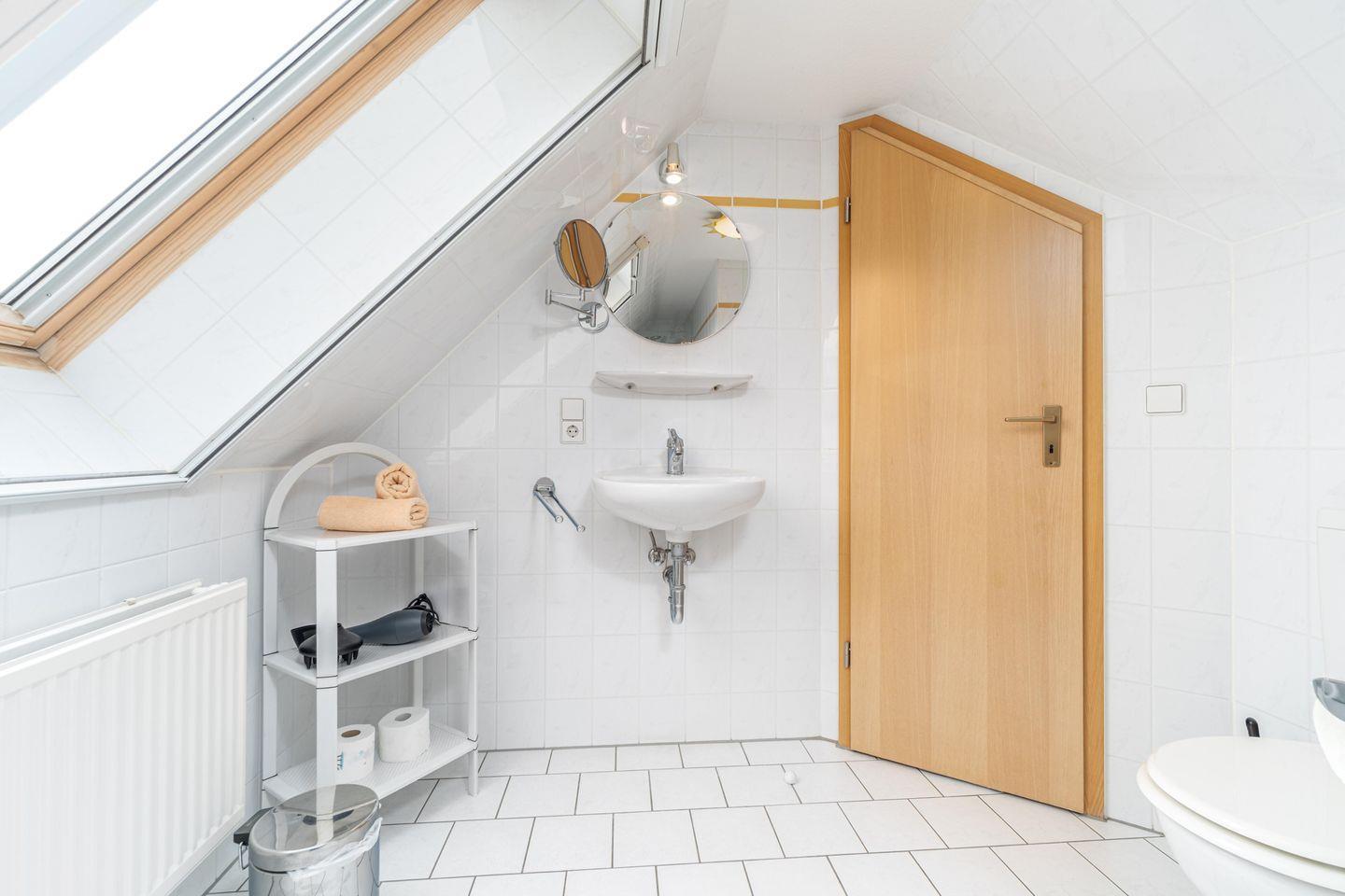 Die zweite Etage beherbergt ein weiteres Schlafzimmer mit Doppelbett und zusätzlichem Einzelbett – damit ist die Ferienwohnung für 5 Personen ideal zugeschnitten. Ein zweites Bad mit Dusche, WC und Waschmaschine sorgt für zusätzlichen Komfort – besonders bei längeren Aufenthalten oder mit Kindern.