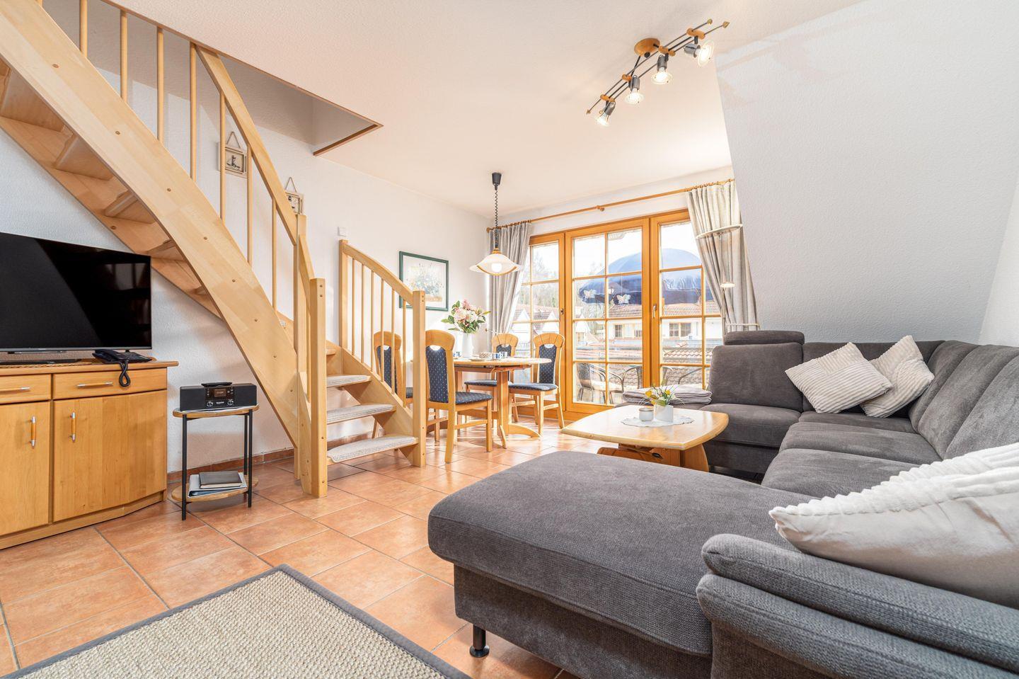 Auf ca. 65?m² Wohnfläche über zwei Etagen genießen Sie modernes Urlaubsambiente und höchsten Komfort. In der ersten Ebene lädt das gemütliche Wohnzimmer mit Sitzgruppe, TV, Radio und DVD-Player zum Verweilen ein. Der angrenzende Essbereich bietet Platz für vier Personen. Von hier aus gelangen Sie auf einen der zwei möblierten Balkone – perfekt für sonnige Frühstücke oder den Abend mit Blick ins Grüne.
