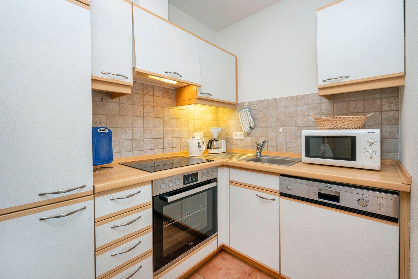 Die Küche ist mit Backofen, Mikrowelle, Kühlschrank mit Gefrierfach, Dunstabzugshaube und Geschirrspüler ausgestattet.