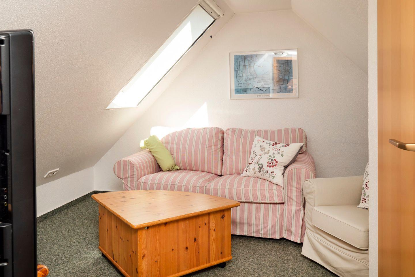 In der ersten Ebene läd das Wohnzimmer mit Sitzgruppe, TV, DVD -Player, Stereoanlage, sowie ein Esstisch für 4 Personen.zum Verweilen ein.