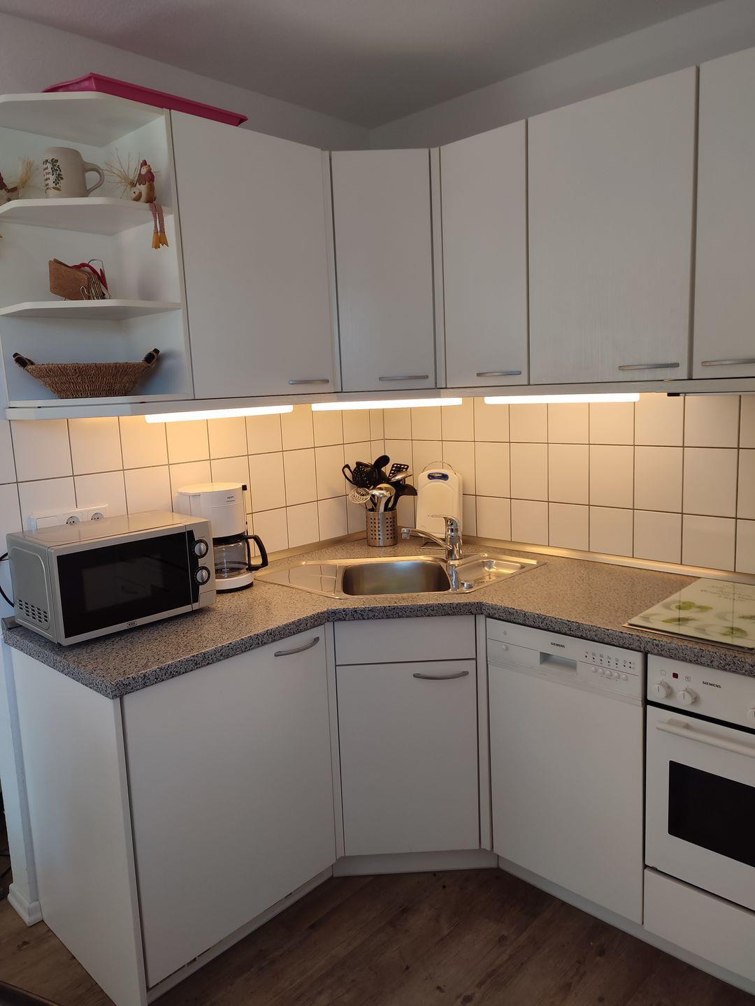 Die Ferienwohnung verfügt über zwei helle und komfortable Schlafzimmer, die eine erholsame Nachtruhe garantieren. Ein Schlafzimmer ist mit einem gemütlichen Doppelbett ausgestattet, während im zweiten Schlafzimmer zwei Einzelbetten bereitstehen. In der offenen, modern eingerichteten Küche können Sie Ihre kulinarischen Fähigkeiten unter Beweis stellen. Ausgestattet mit einem Herd, Backofen, Mikrowelle und Geschirrspüler bieten wir Ihnen alles, was Sie benötigen, um schmackhafte Mahlzeiten zuzubereiten. Genießen Sie Ihre Mahlzeiten im angrenzenden Wohnbereich oder auf dem Südbalkon mit gemütlichen Balkonmöbeln, von dem aus Sie frische Luft schnappen können.