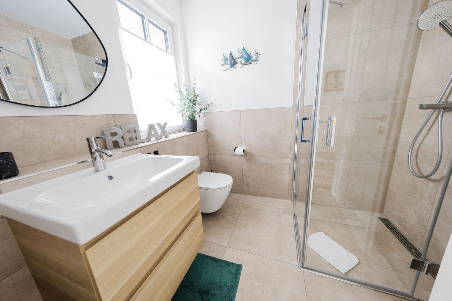 Die beiden Bäder sind mit einer bodentiefen Dusche, Handtuchheizkörper, Föhn ausgestattet. Die Sauna ist im Erdgeschoss im kleinen Bad eingebaut und kann für 2,00 € / 2 Stunden genutzt werden. Dieses haben wir nachträglich aus Sicherheitsgründen eingebaut.