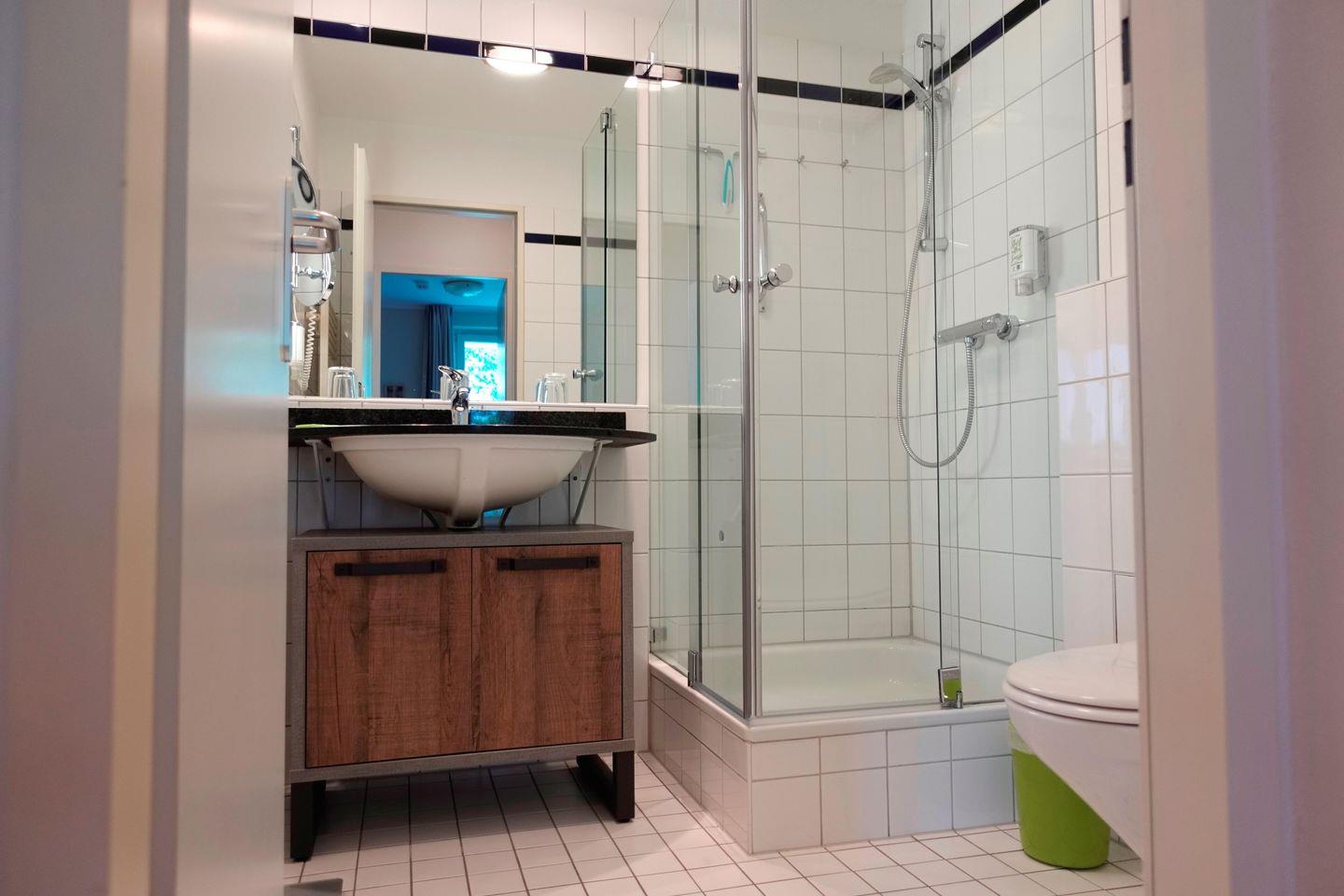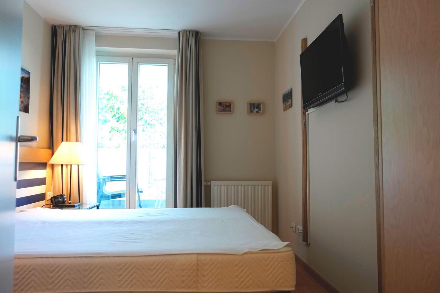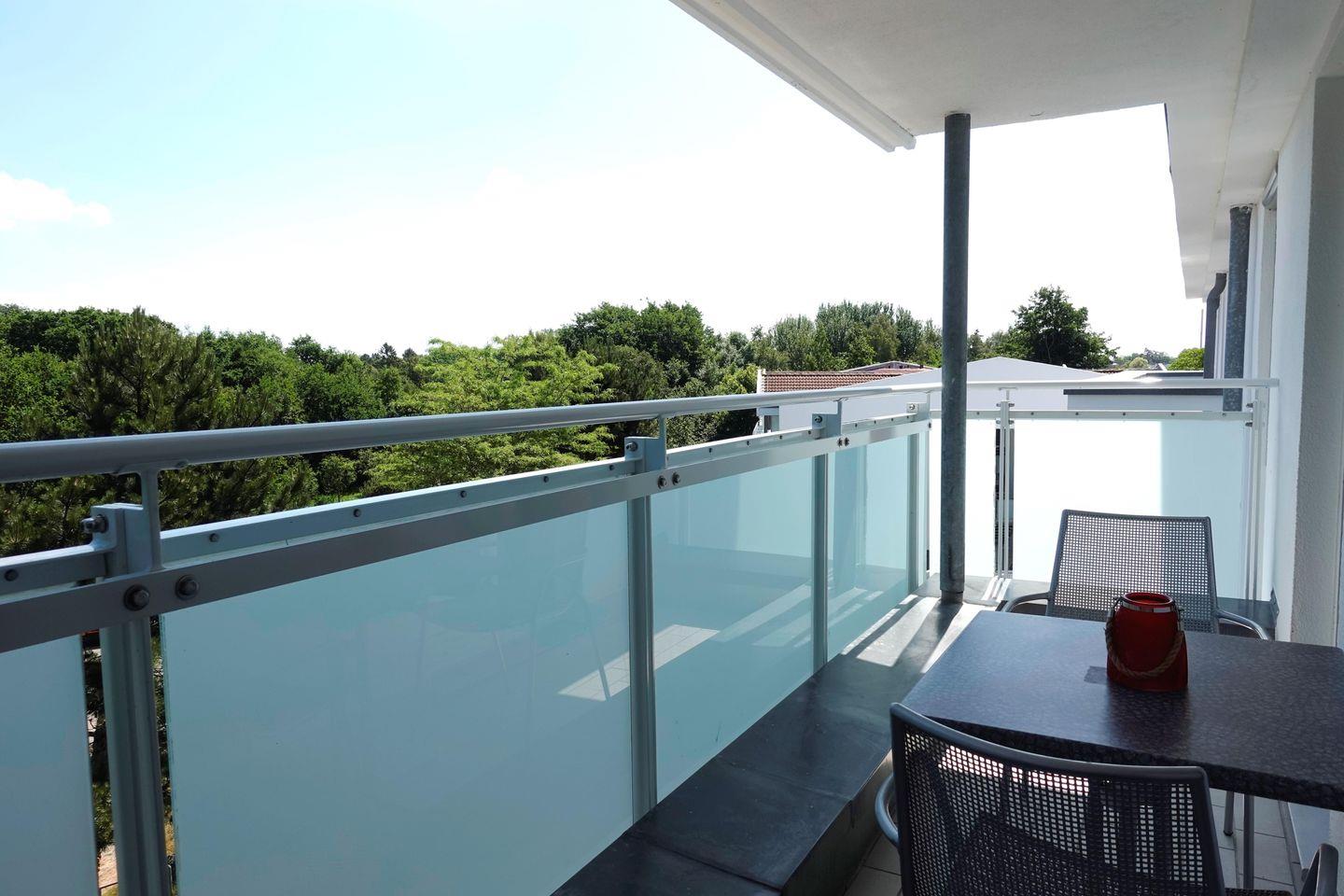 Vom Wohn- und Schlafzimmer aus haben Sie jeweils Zugang zum überdachten und möblierten Ostbalkon mit Blick ins Grüne und in den Kurpark. In der Ferienunterkunft steht Ihnen kostenfreies WLAN zur Verfügung. Schlafzimmer und Wohnzimmer sind mit Holzparkett – Fußboden ausgestattet, das geflieste Badezimmer verfügt über eine Dusche, ein WC und ein Waschbecken mit Unterschrank. Zur Ferienwohnung gehört ein kostenfreier Stellplatz in der Tiefgarage (beschildert), in die Sie von der Seestraße aus hinein fahren können. Mit dem Personenaufzug gelangen Sie von hier aus mühelos zu Ihrer Ferienwohnung (Gepäckwagen in der Tiefgarage vorhanden).