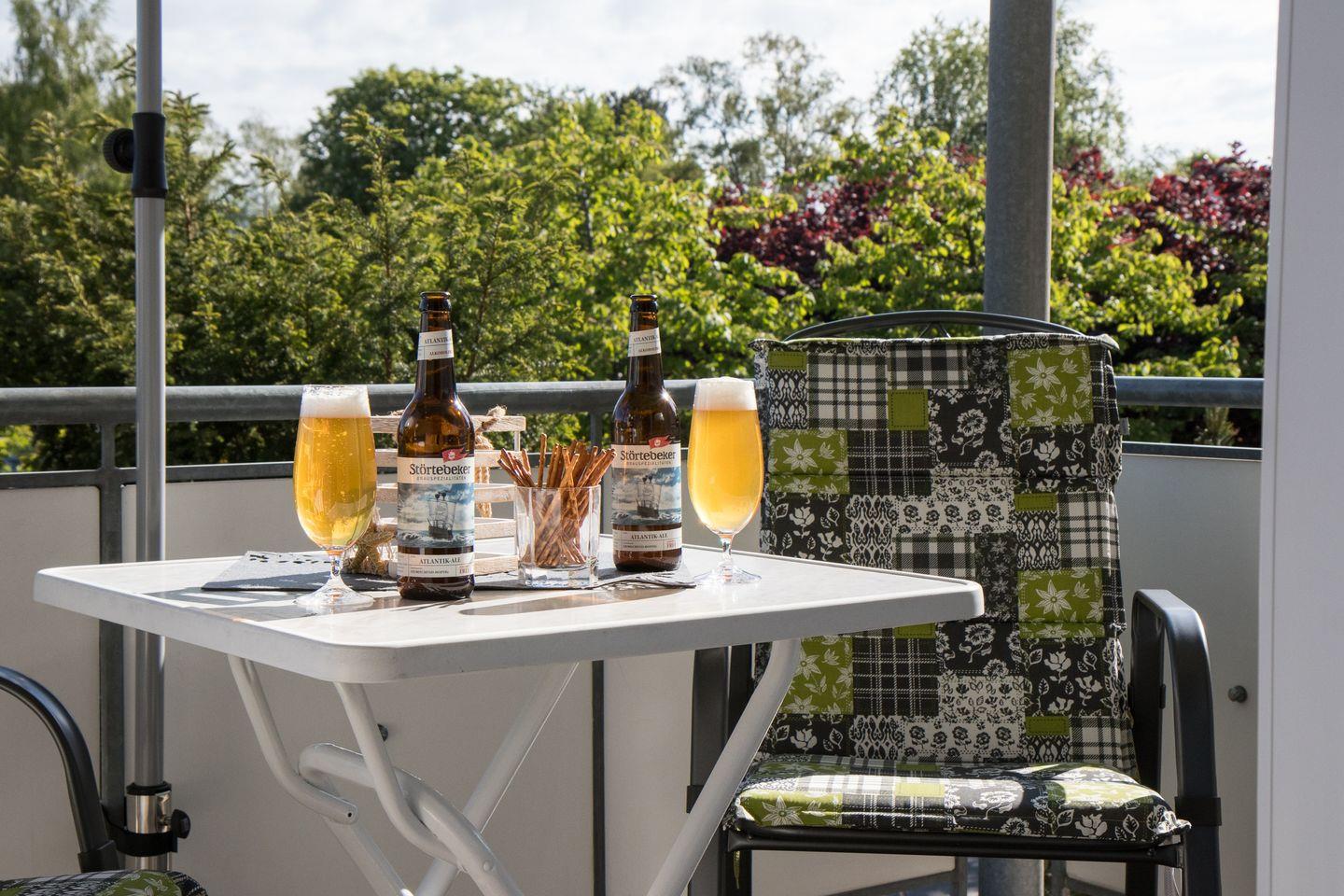 Die gut ausgestattete Kochnische lässt keine Wünsche offen und ist mit einem Herd, einem Kühlschrank, einer Mikrowelle, einer Kaffeemaschine sowie einem Toaster ausgestattet. Hier können Sie Ihre Lieblingsgerichte zubereiten und diese herrlich auf dem Balkon genießen, der mit Gartenmöbeln ausgestattet ist und Ihnen einen Ort der Entspannung im Freien bietet. Der moderne TV sorgt für vielfältige Unterhaltungsangebote an gemütlichen Abenden.