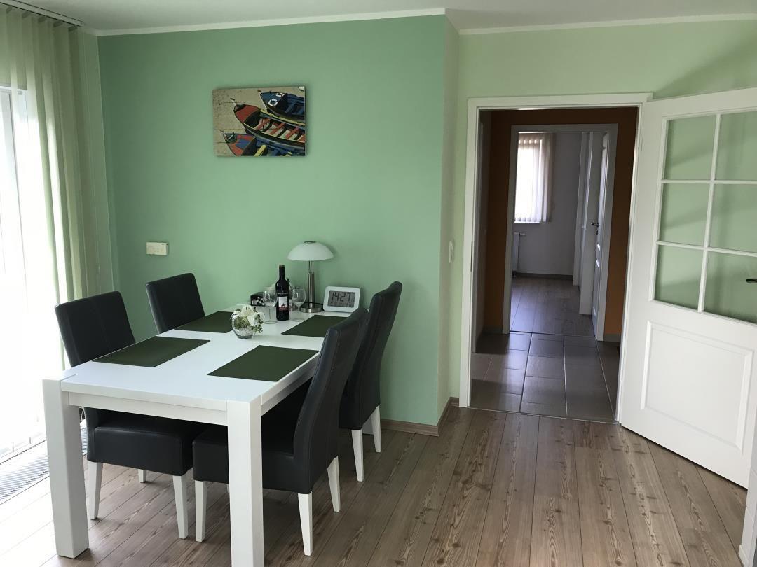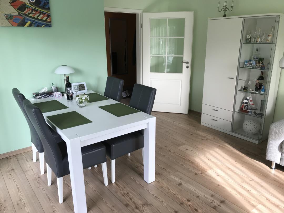 Die im 1. OG befindliche Wohnung bietet Platz für max. 3 Personen. Sie ist sehr geschmackvoll und komfortabel eingerichtet. Hier werden Sie einen erholsamen Urlaub an der Ostsee verbringen können. Das helle Wohnzimmer verfügt über einen Essplatz mit Tisch mit 4 Stühlen und einem Sitzbereich zum Entspannen mit Flachbild-TV, DVD-Player, Spielen und Büchern zur Unterhaltung. Der vom Wohnzimmer begehbare Balkon ist mit einem Esstisch und 3 Stühlen ausgestattet. Hier können Sie die Abendsonne genießen.