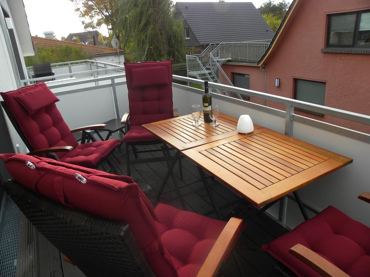 Das helle Wohnzimmer verwöhnt Sie mit einem großen Wohnbereich mit großzügigem Essplatz und integrierter voll ausgestatteter Einbauküche inkl. Geschirrspüler, Kühl-/Gefrierschrank, Backofen und Mikrowelle für die Selbstverpflegung. Ein gemütlicher Sitzbereich bietet Fernseher, Stereoanlage, Radio und CD-Player zur Unterhaltung. Ein kostenfreier WLAN-Anschluss steht Ihnen zur Verfügung. Der vom Wohnzimmer begehbare Balkon ist mit einem Esstisch und 4 Stühlen ausgestattet. Hier können Sie die Abendsonne genießen. Als Sonnenschutz an sonnigen Tagen ist eine Markise vorgesehen.