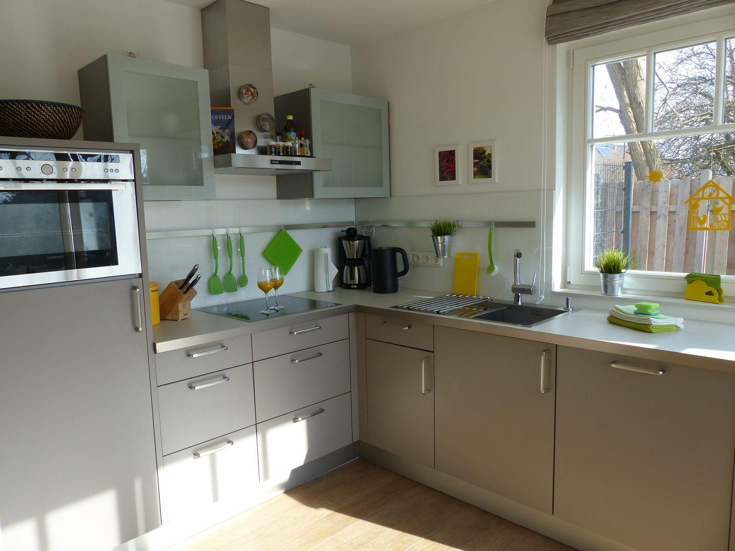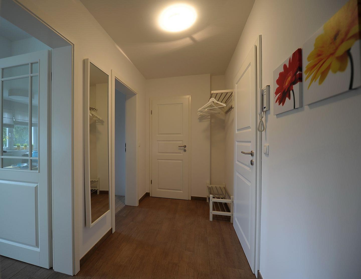 Das Schlafzimmer ist mit einem komfortablen Boxspringbett (2,00 x 1,80 m) ausgestattet. Die Ferienwohnung bietet eine komfortable Einbauküche und ein modernes Bad mit Dusche.