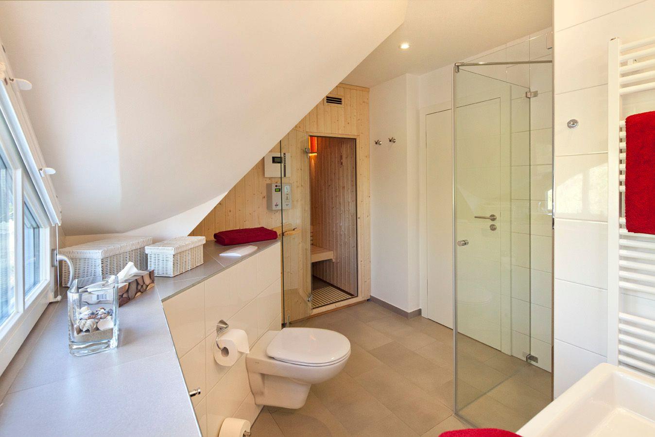 Das gesamte EG ist hell gefliest. Der im EG befindliche Flur ist mit einem Schuhschrank ausgestattet. Beide Bäder verfügen über eine ebenerdige Dusche und WC; das Bad im OG über eine zusätzliche Sauna.
