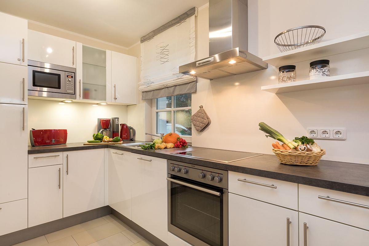 Im Erdgeschoss befinden sich der nach Süden ausgerichtete Wohnbereich mit lichtdurchfluteter Darß-Veranda und offener hochwertiger komplett ausgestatteter Einbauküche mit Backofen, Spülmaschine, Mikrowelle und Kühl/Gefrier-Kombination. Die Ausstattung wird komplettiert mit einem großzügiger Essplatz, einer gemütlichen Ledersitzcouch, ein Kaminofen mit Sichtfenster, einem Flachbildschirm mit Satellitenanschluss, einem CD-Radio und einem kostenfreien WLAN für den Internetzugang.