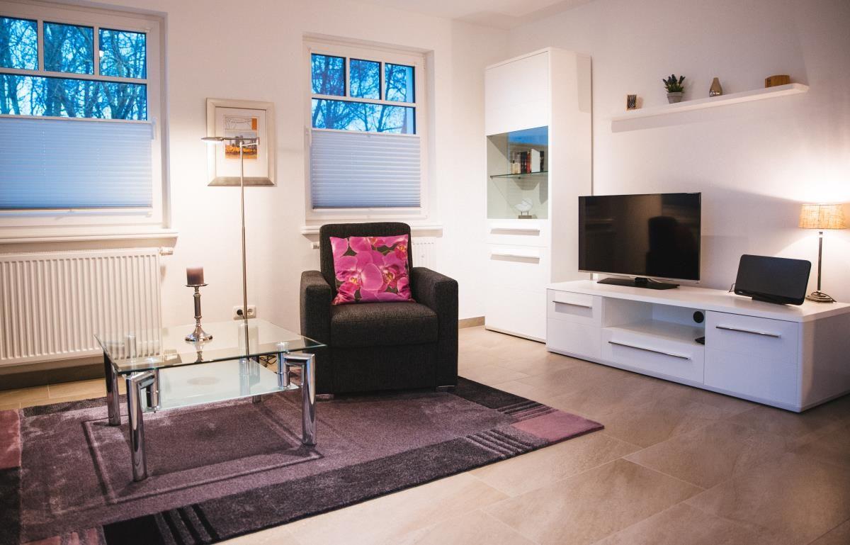 Die gesamte Ferienwohnung ist mit Fußbodenheizung ausgestattet. Im modern eingerichteten Wohnzimmer finden Sie eine gemütliche Sitzecke mit HD-Fernseher, DVD-Player und Stereoanlage vor. Ein kostenfreier WLAN-Anschluss ist vorhanden.