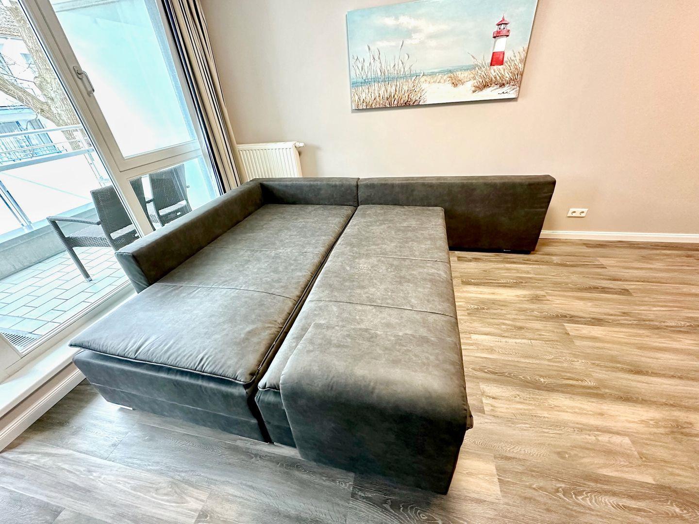 2 Personen im Wohnzimmer zur Verfügung. Der vom Wohnzimmer abgehende Balkon mit Gartenmöbeln ist zur Ost-Seite ausgerichtet, liegt sehr ruhig und lädt zum Verweilen ein. Von hier aus lässt sich ein Seitenblick auf die Ostsee erhaschen. Wohnbereich, Schlafzimmer und Flur sind mit hochwertigem Vinyl-Fußboden ausgestattet. Ein kostenfreier WLAN-Zugang steht zur Verfügung. Ihren Hund können Sie nach vorheriger Anmeldung gerne mitbringen.