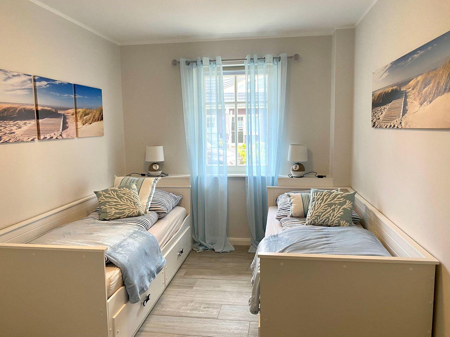 Verdunklungsmöglichkeiten in den Schlafzimmern sind vorhanden.