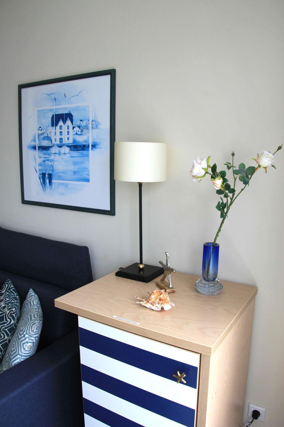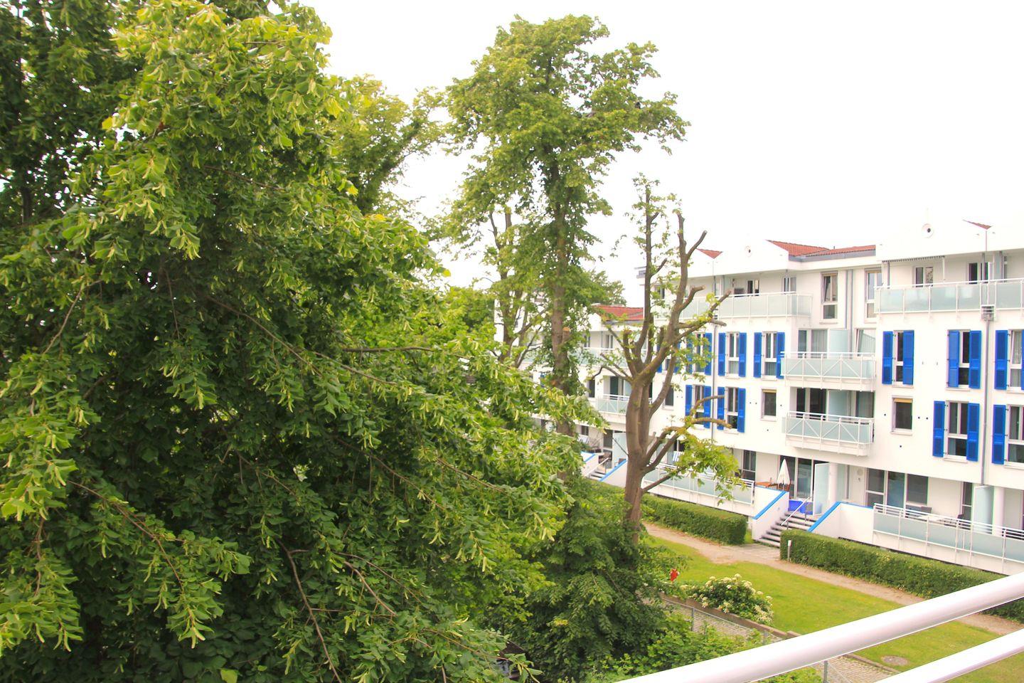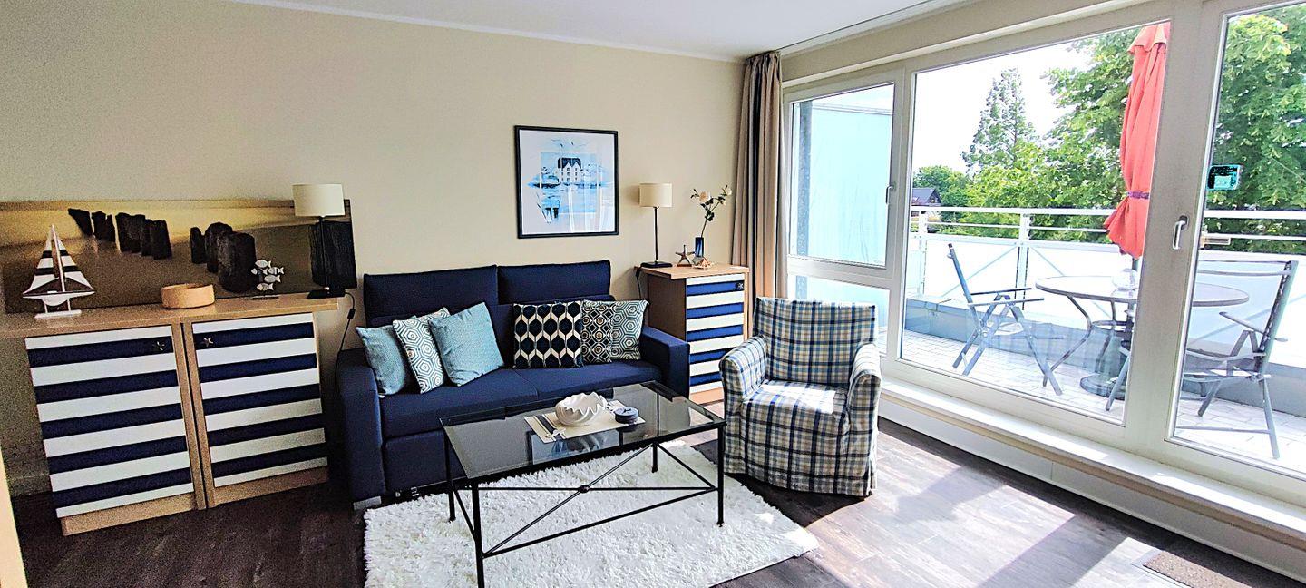 Wer sich ungestört sonnen oder die Abendsonne an der frischen Ostseeluft mit einem Gläschen Wein genießen möchte, dem steht dafür der Balkon mit gemütlichen Terrassenmöbeln und einem Strandkorb zur Verfügung.