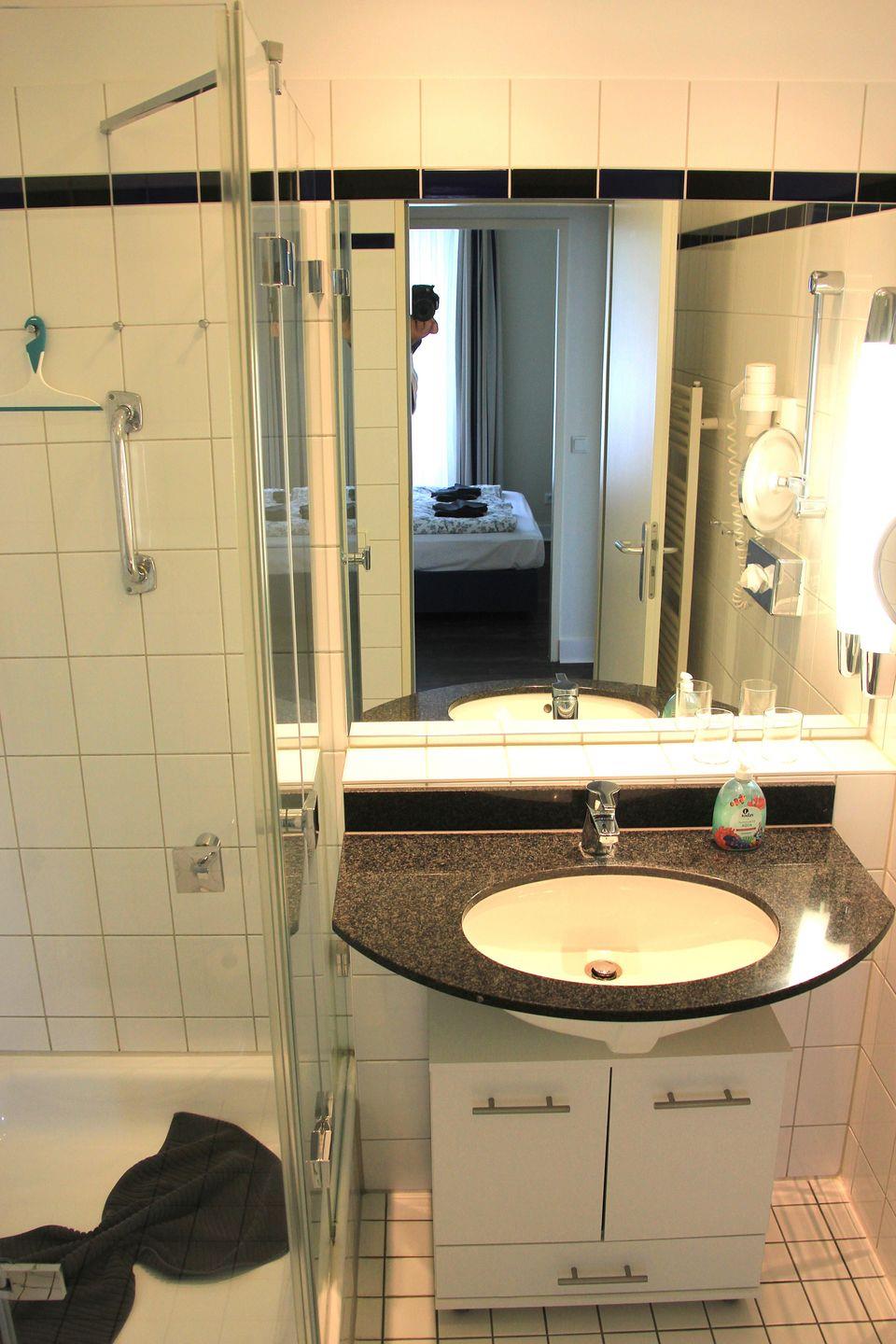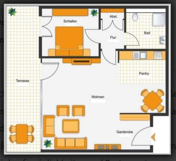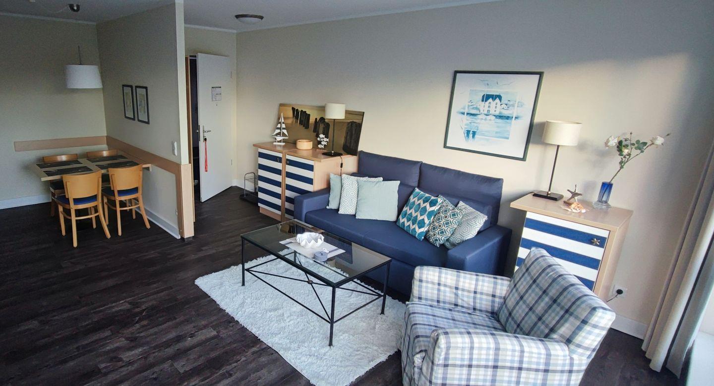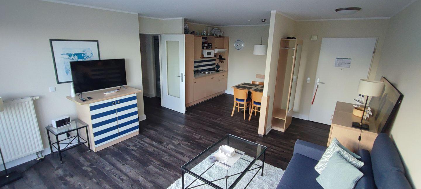 Das 2-Raum-Apartment (ca. ·51 m2) umfasst ein Wohnzimmer mit offener Küche, Schlafzimmer und ein Bad mit Dusche, Toilette, Schminkspiegel, Badhocker und Fön. Das großzügige Wohnzimmer ist modern und gemütlich geschnitten.