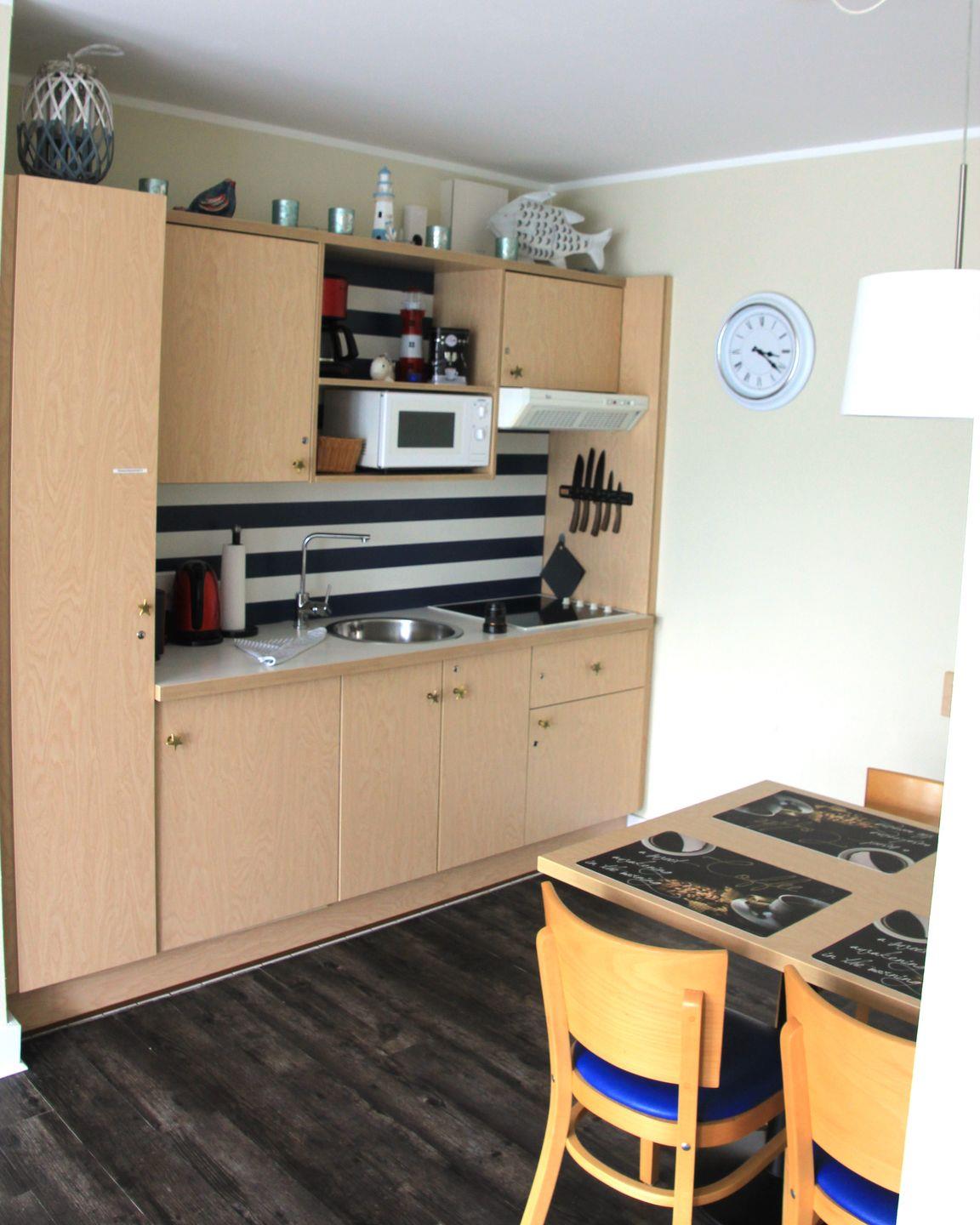 Dafür nutzen Sie Kühlschrank mit Gefrierfach, Herd, Mikrowelle, Kaffeemaschine, Wasserkocher, Geschirr und Küchenausstattung.