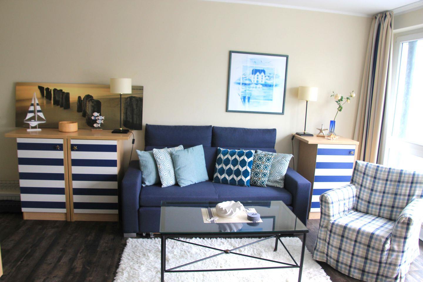 Schlafmöglichkeiten finden Sie im Wohnzimmer (Schlafcouch für 2; 1,50 x 1,90) und im Schlafzimmer (Doppelbett; 1,80 x 2,00).