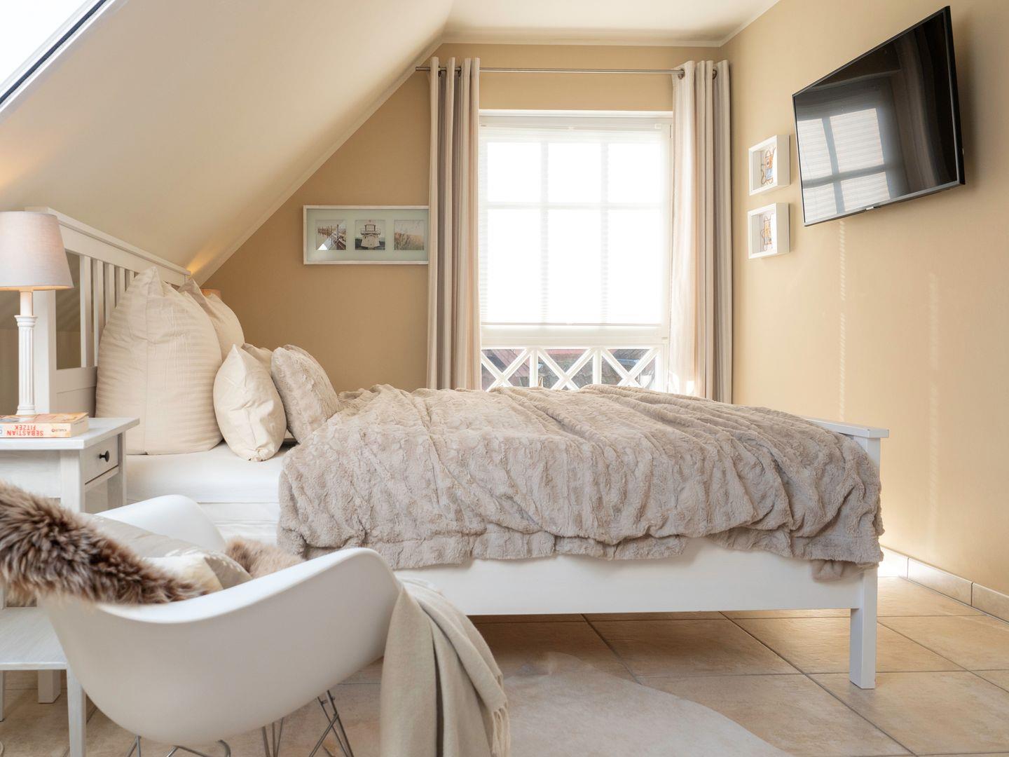 Mit drei ruhigen und komfortablen Schlafzimmern mit zwei Doppel – und zwei Einzelbetten mit komfortablen Matratzen (4 Jahreszeiten Feder-Daunen-Betten (Decke 140x200cm, Kissen 80x80cm und 40x80cm),bietet der Ostseezwilling 2 seinen Gästen erholsame Nächte und viel Platz für Ihre Kleidungsstücke. Für noch mehr Schlafkomfort sorgen Plissees, Insektenschutzgitter und Außenrollläden.