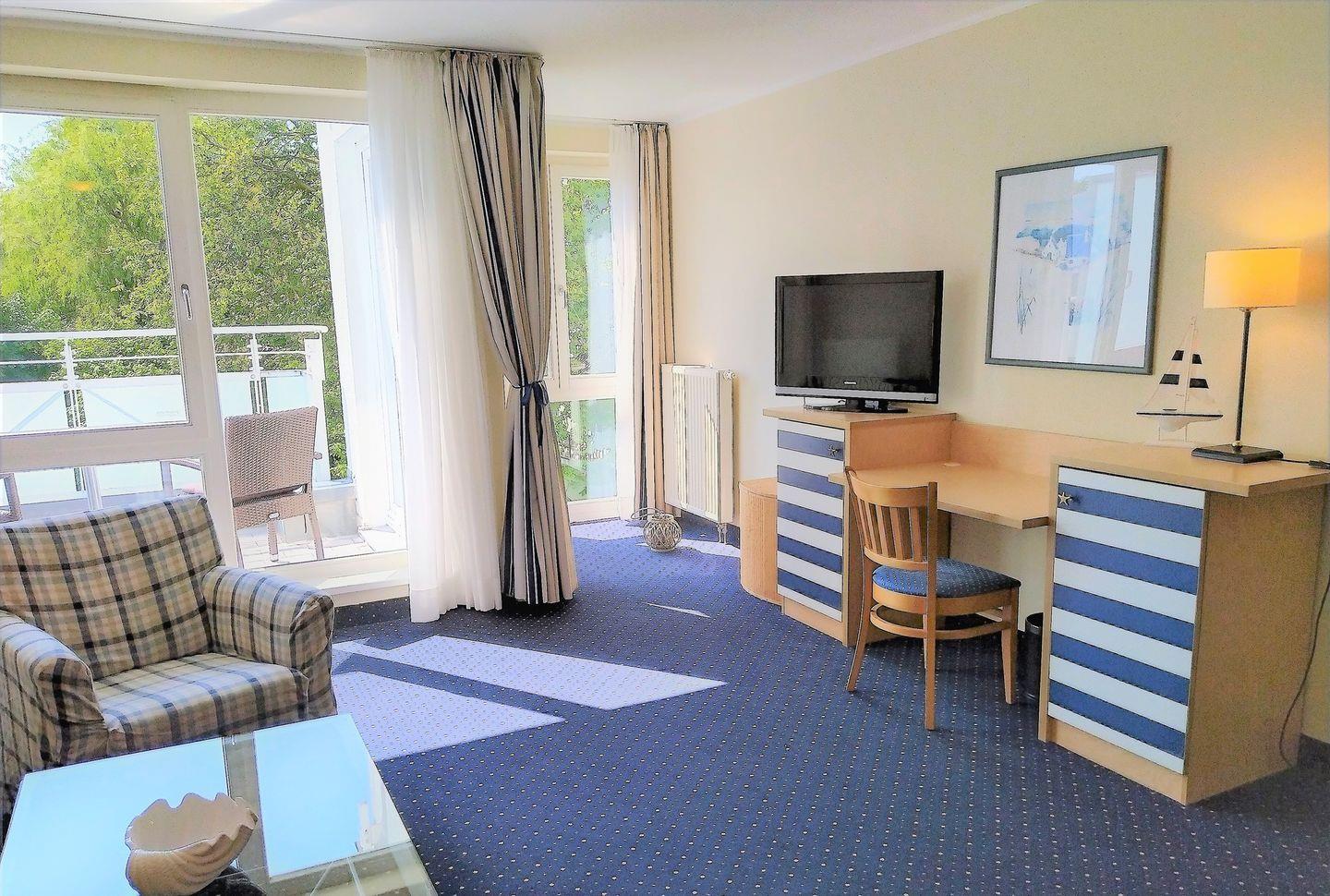 Ein großes Wohnschlafzimmer mit Schlafcouch, Schreibtisch, komplette Küche und Essecke, Schlafzimmer mit Doppelbett, Bad mit WC/Dusche, Balkon in Süd-Ost-Lage, TV, Wi-Fi (drahtloser Internetzugang) kostenlos