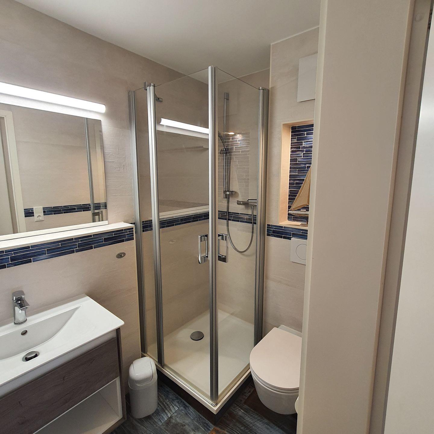 Das Badezimmer ist mit Dusche und WC ausgestattet.