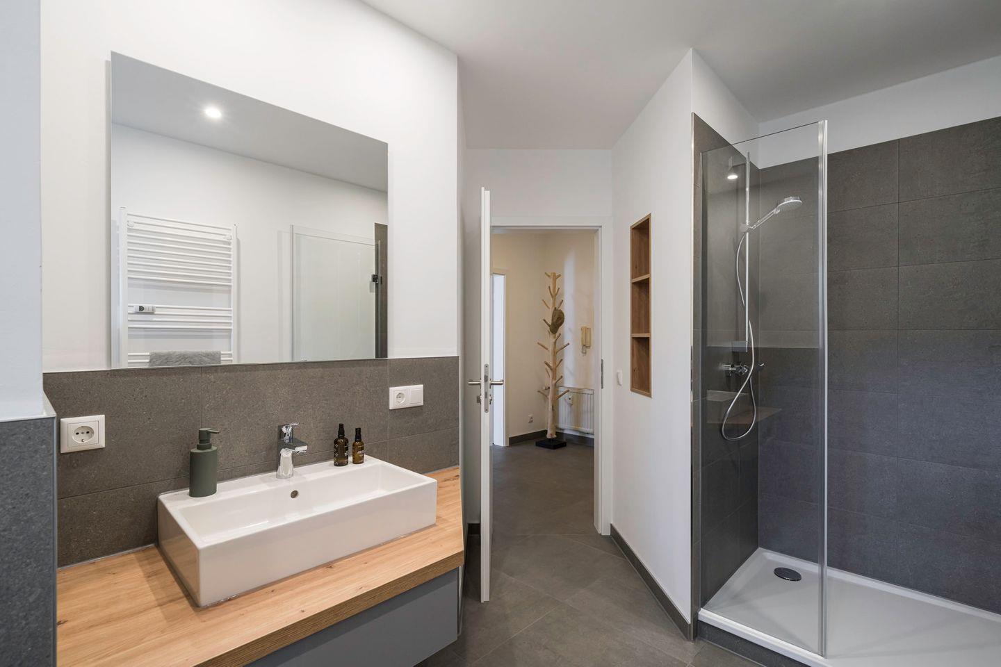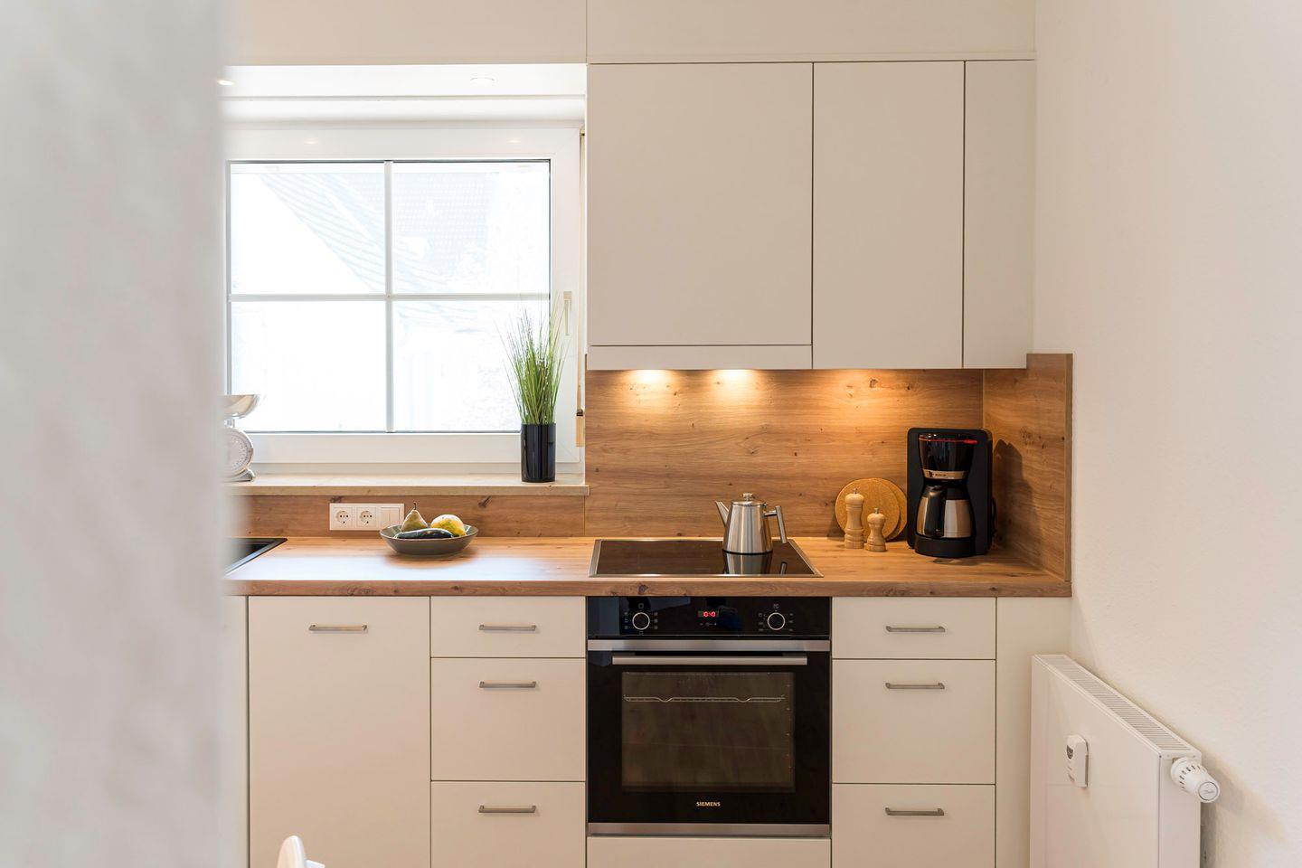 Das Highlight des Apartments ist die offene Wohnküche, die sich ideal für gemeinsames Kochen und Verweilen eignet. Sie ist voll ausgestattet mit modernen Geräten, die es Ihnen ermöglichen, sich mit frischen Zutaten aus der Region zu versorgen und köstliche Mahlzeiten zuzubereiten. Vom Essbereich gelangen Sie direkt auf die angrenzende Terrasse, die der perfekte Ort für Ihr Frühstück in der Morgensonne oder ein entspanntes Abendessen unter freiem Himmel ist. Wenn Sie mit dem Rad kommen, können Sie den abschließbaren Fahrradschuppen zum Unterstellen nutzen.