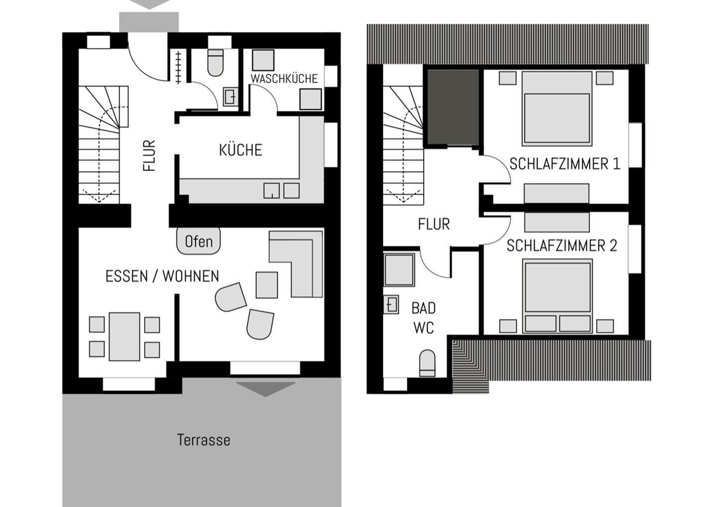 Im Obergeschoss befinden sich 2 Schlafzimmer mit je einem Doppelbett und ein Bad mit Dusche.