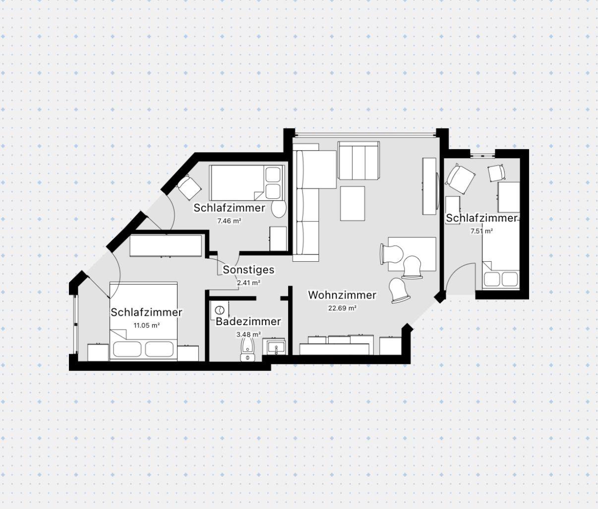 Über den Eingangsbereich mit Garderobe gelangen Sie in eines von insgesamt drei Schlafzimmern sowie den lichtdurchfluteten Wohnbereich. Dieser unterteilt sich in die offene Küche, eine Essecke sowie einen großzügigen Sitzbereich, der zum Verweilen einlädt. Über einen kleinen Flur erreichen Sie das innenliegende Duschbad mit WC, das Schlafzimmer mit bequemem Doppelbett sowie ein weiteres Zimmer mit Einzelbett. Beide Räume verfügen über einen Zugang zum Balkon.