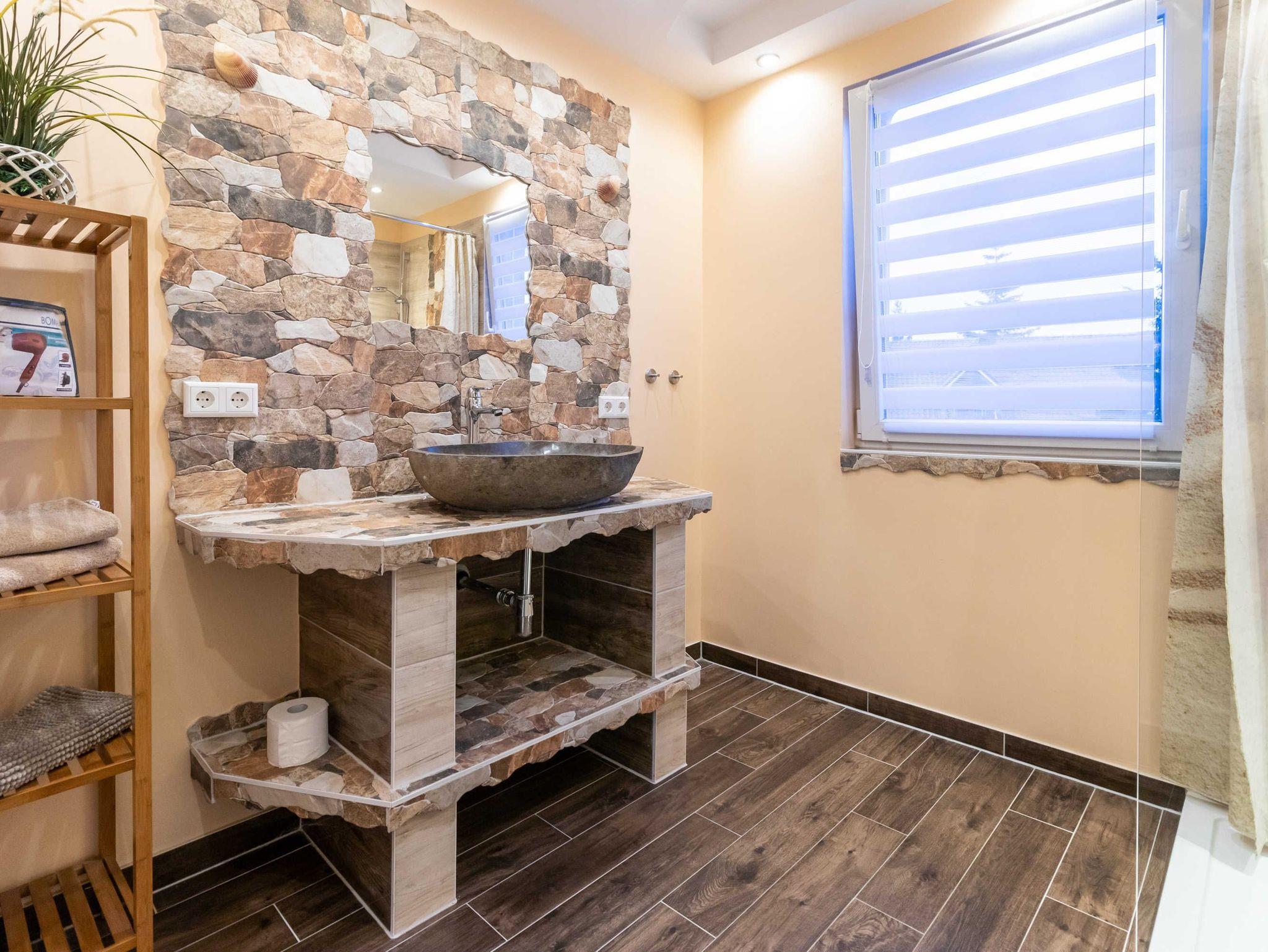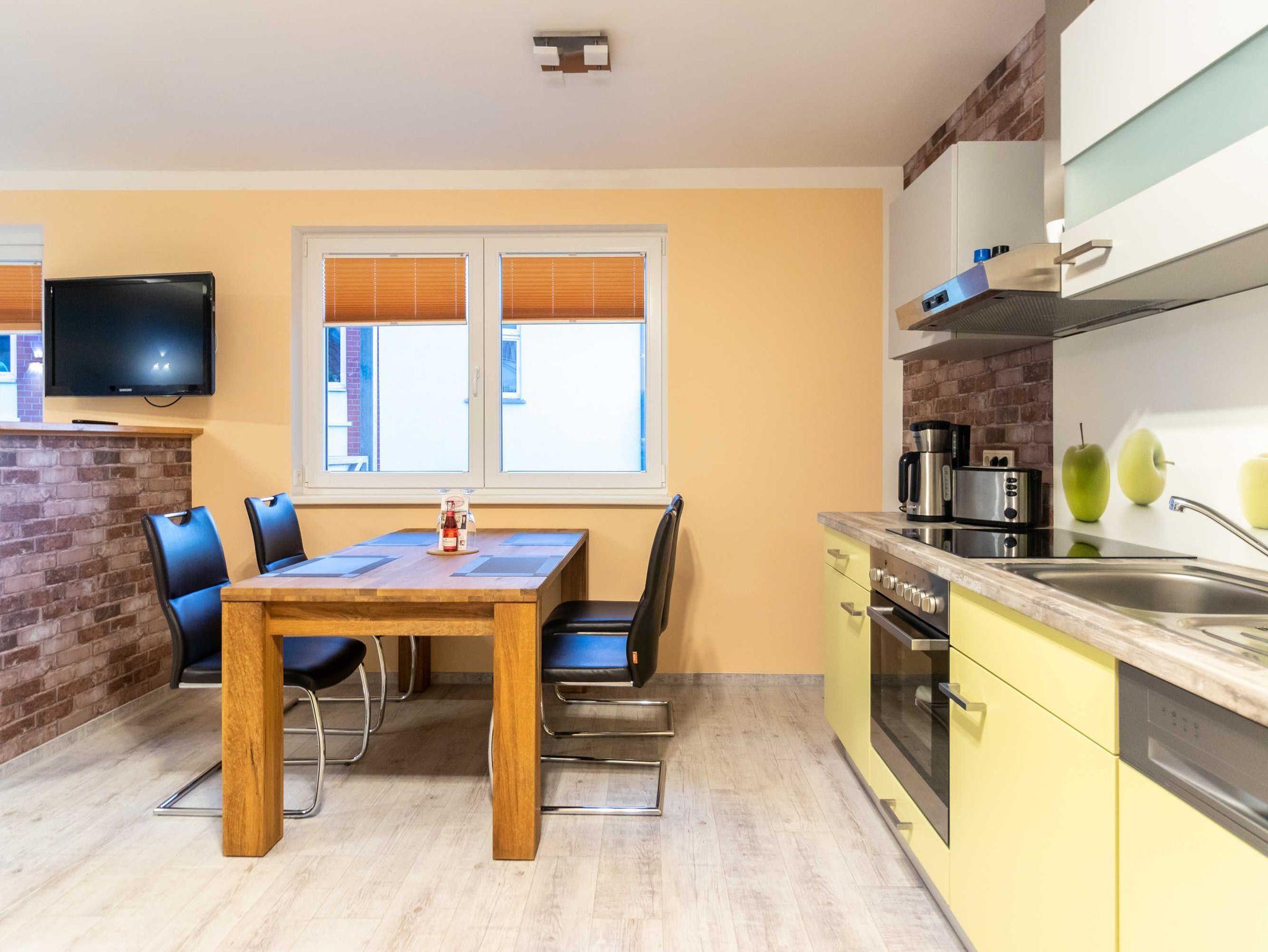 Wir bieten Ihnen eine liebevoll eingerichtete Ferienwohnung fü 2 Erwachsene mit 60 qm Wohnfläche, aufgeteilt in einen großzügigen Wohnbereich mit Schlafcouch, Esstisch, Balkon mit Südlage und hochwertiger, komplett ausgestatteter Einbauküche. Es ist 1 Schlafzimmer mit großem Doppelbett vorhanden. Ein indivduell mit Fliesen und Naturstein gestaltetes einmaliges Bad , sowie ein Flur ergänzen die Ferienwohnung. WLAN und ein Parkplatz sind inklusive.