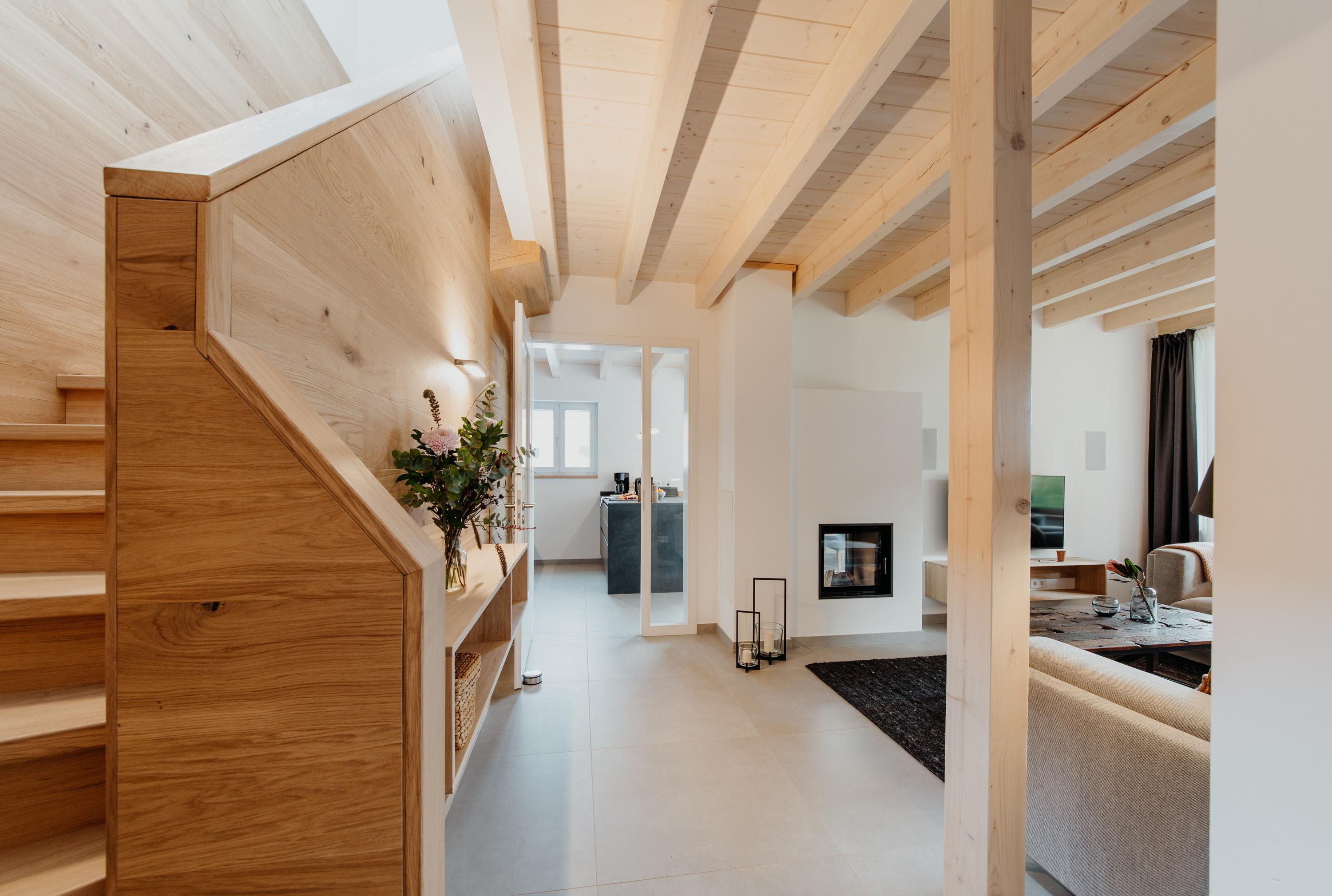 Im Erdgeschoss befinden sich die Küche, der Essbereich, das Wohnzimmer sowie das Wellnessbad mit Sauna, Wellnessbadewanne mit Skin Touch und Dusche. Vom Essbereich gelangen Sie direkt auf die überdachte Terrasse und in den dazugehörigen Garten.