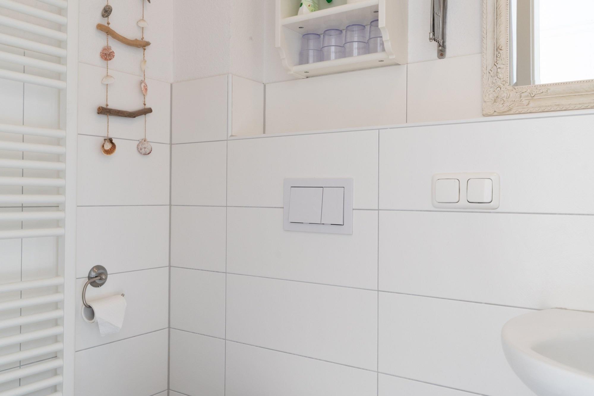 Das Badezimmer verfügt über eine Dusche (mit Absatz) und WC.