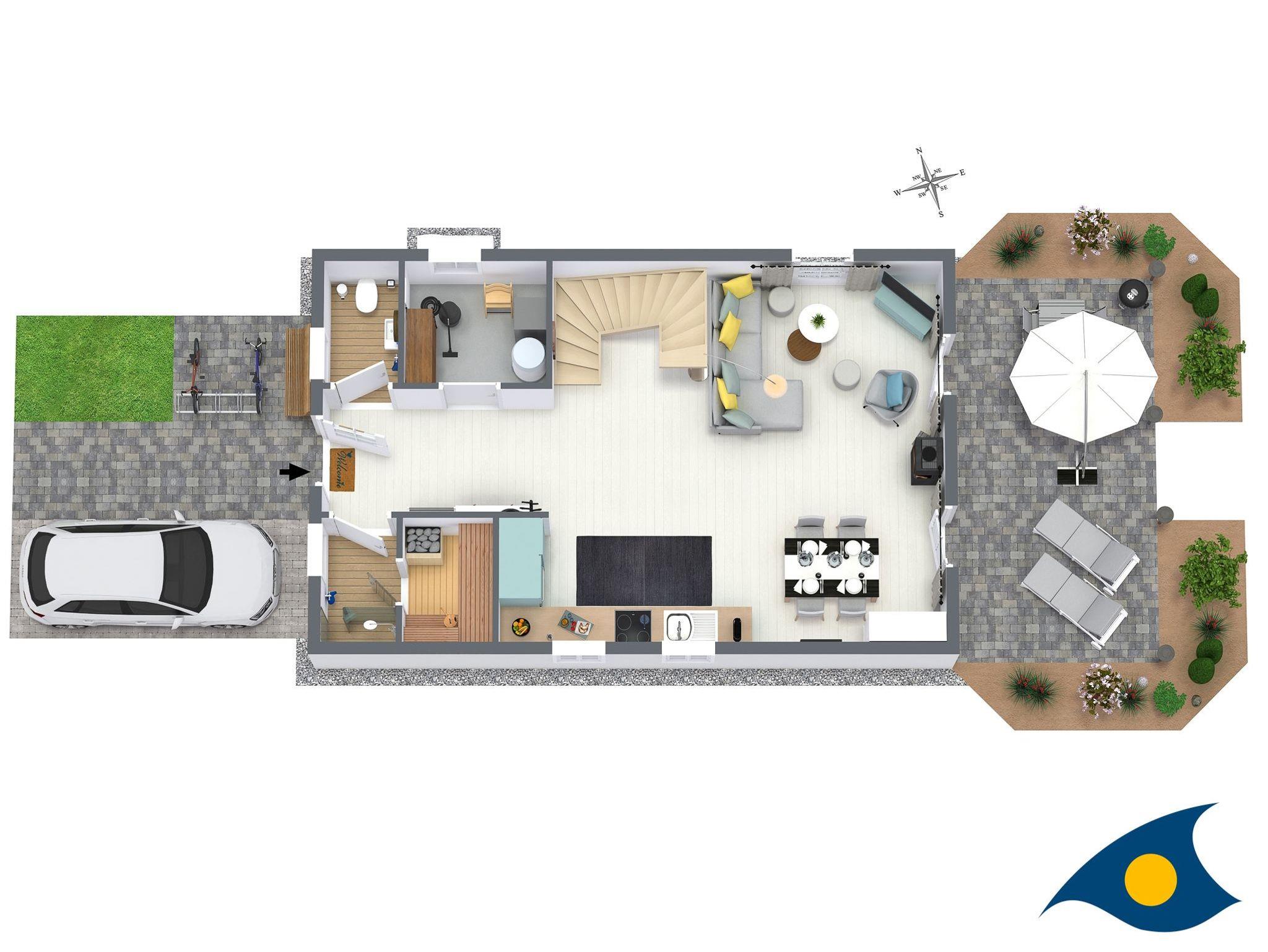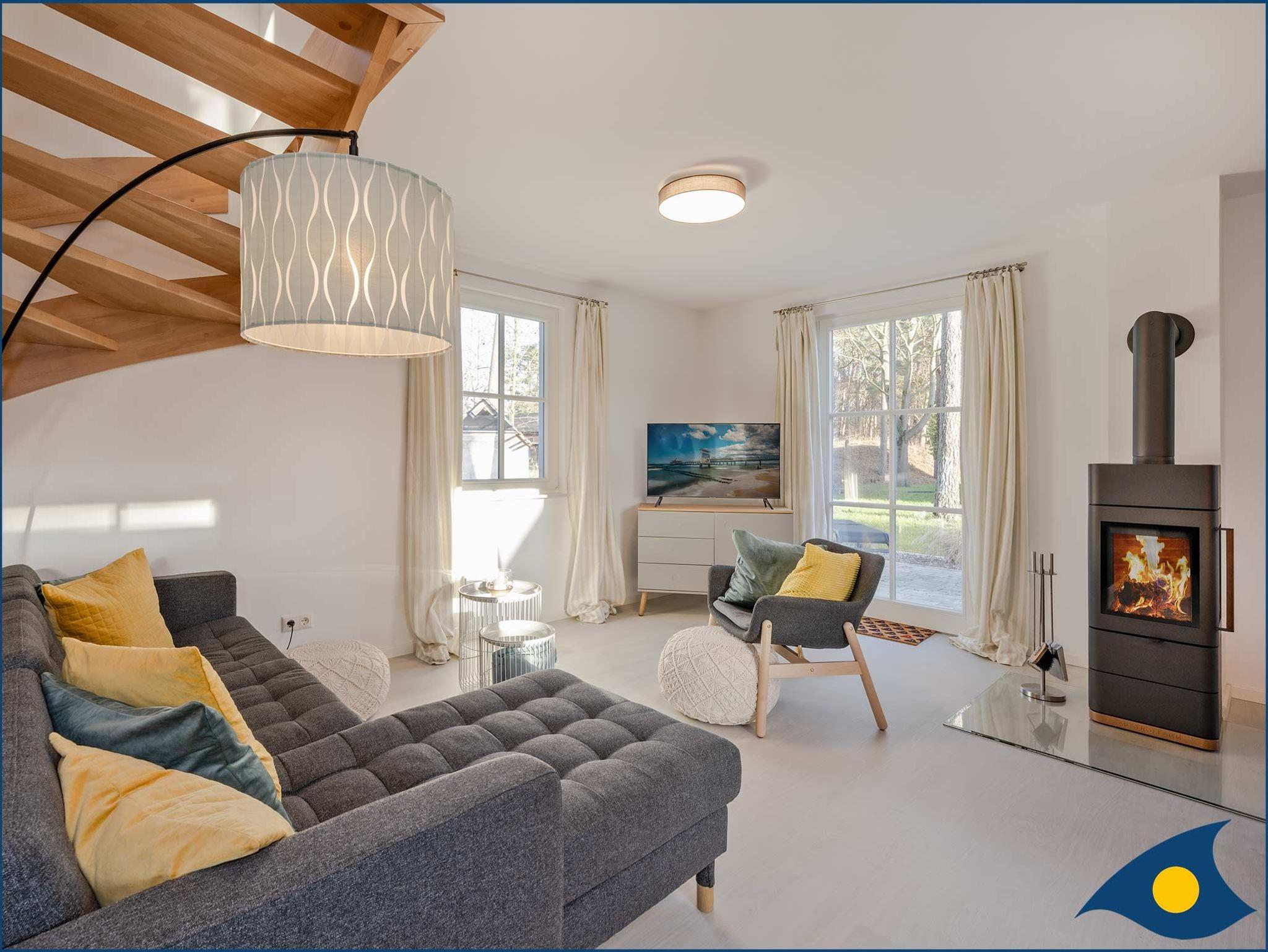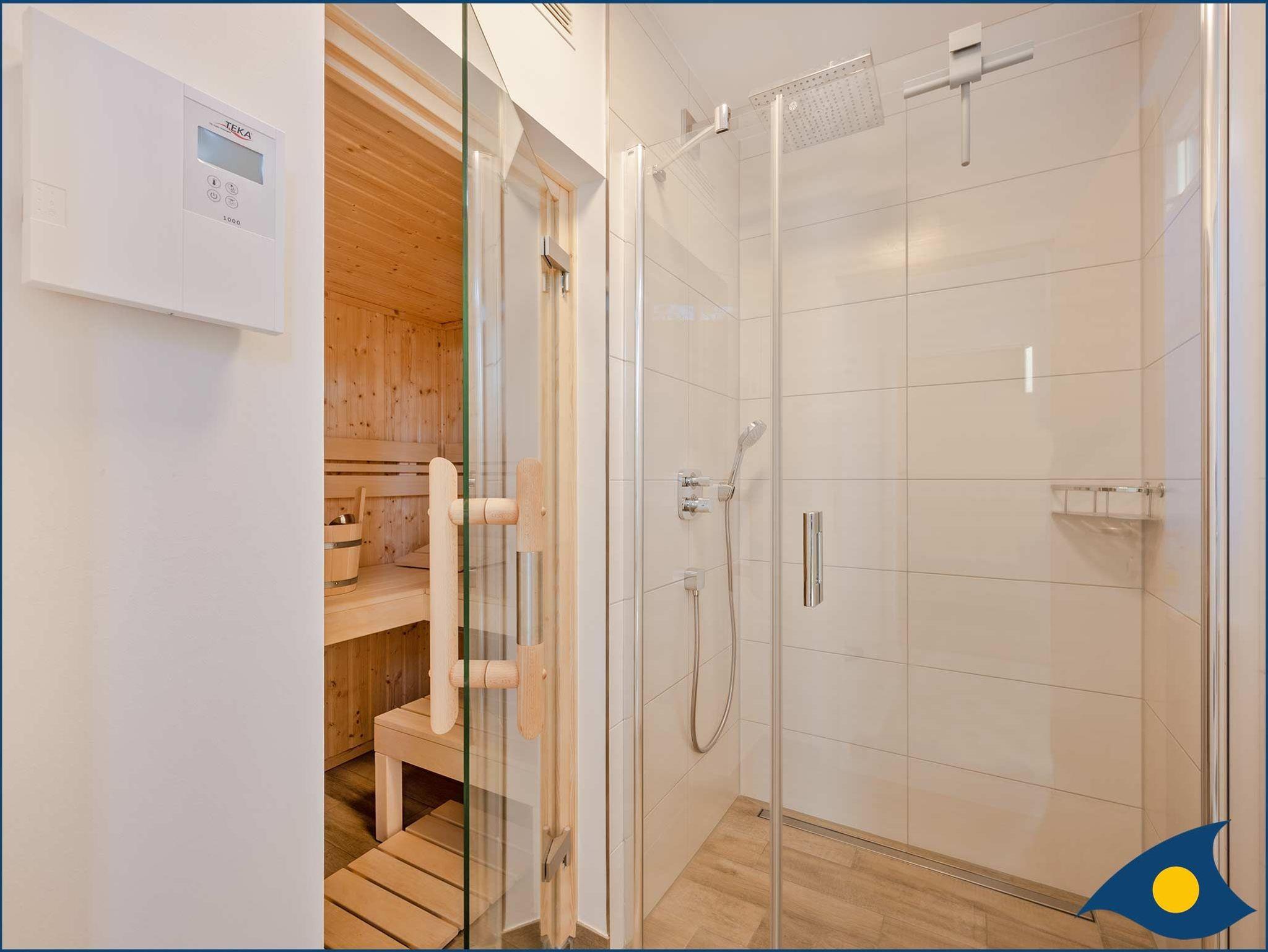 In der offenen Küche mit angrenzendem Essplatz und Wohnzimmer werden gemeinsame Abende zu einem gemütlichen Zusammensein. Das Badezimmer im Erdgeschoss verfügt über eine Sauna und eine Dusche.