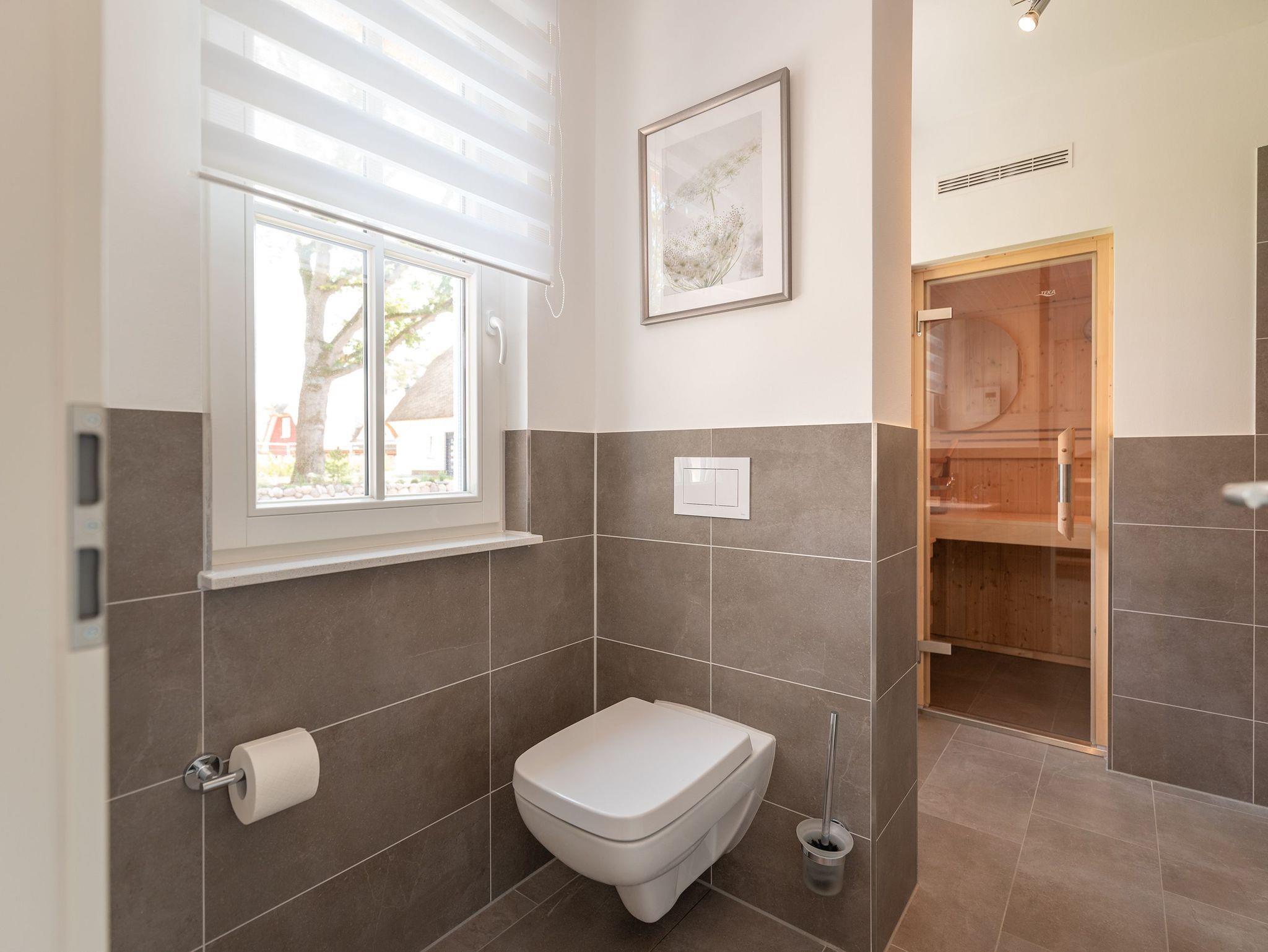 Zur weiteren Ausstattung gehören zwei großzügige Badezimmer: Das Badezimmer im Erdgeschoss verfügt über eine Sauna und eine Regendusche, während das Badezimmer im Obergeschoss mit einer Dusche und einer Badewanne ausgestattet ist.