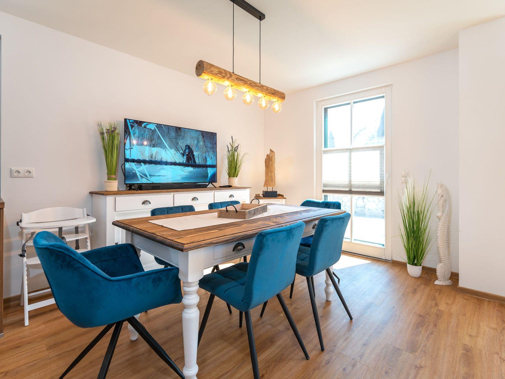 Der offene, helle Wohnbereich lässt entspannte Urlaubstimmung aufkommen. Eine gemütliche Schlafcouch (Aufbettung möglich) mit großem Flatscreen-TV, Ein Kamin, ein Esstisch für bis zu 6 Personen und eine modern ausgestattete Küchenzeile mit Geschirrspüler, Kaffeemaschine, Toaster, Mikrowelle und Wasserkocher bilden einen gelungenen Wohnbereich für die ganze Familie.