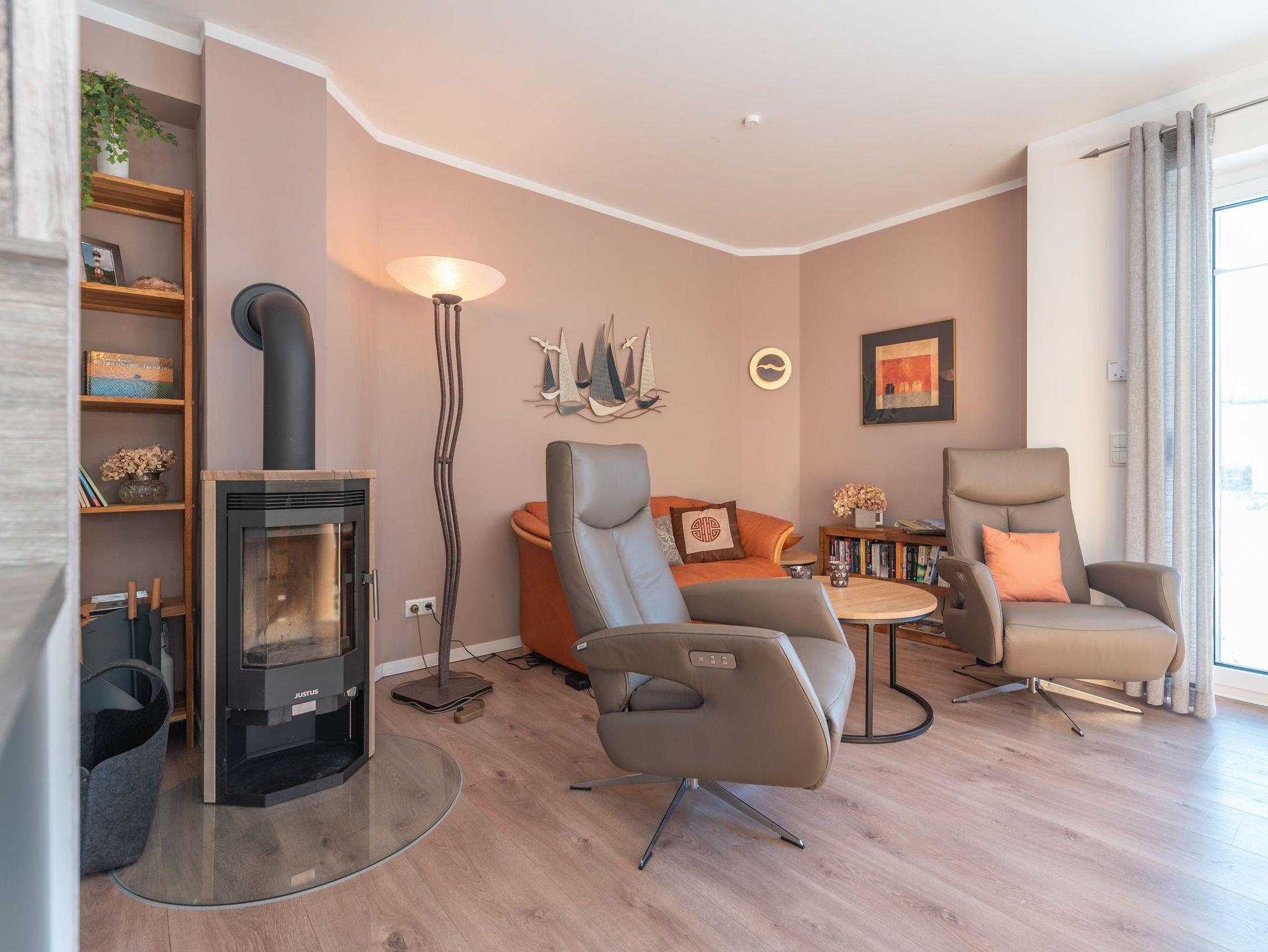 • Wohnbereich mit gemütlicher Couch, Smart-TV, Fernsehsesseln und Kamin
