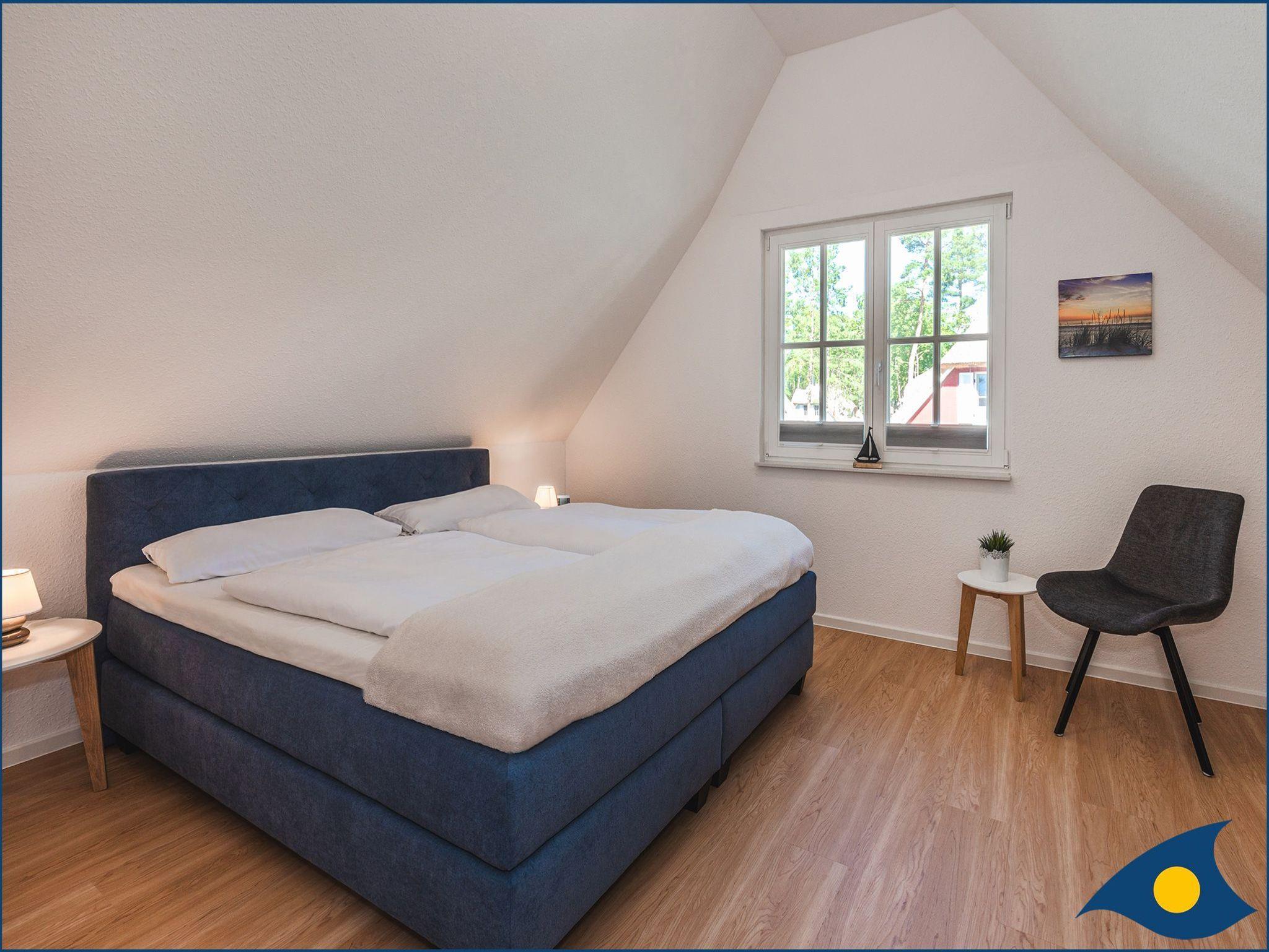 Das Obergeschoss ist aufgeteilt in zwei Schlafzimmer (eins mit Doppelbett und eins mit zwei Einzelbetten) sowie einem großzügigen Badezimmer mit Dusche und Badewanne.