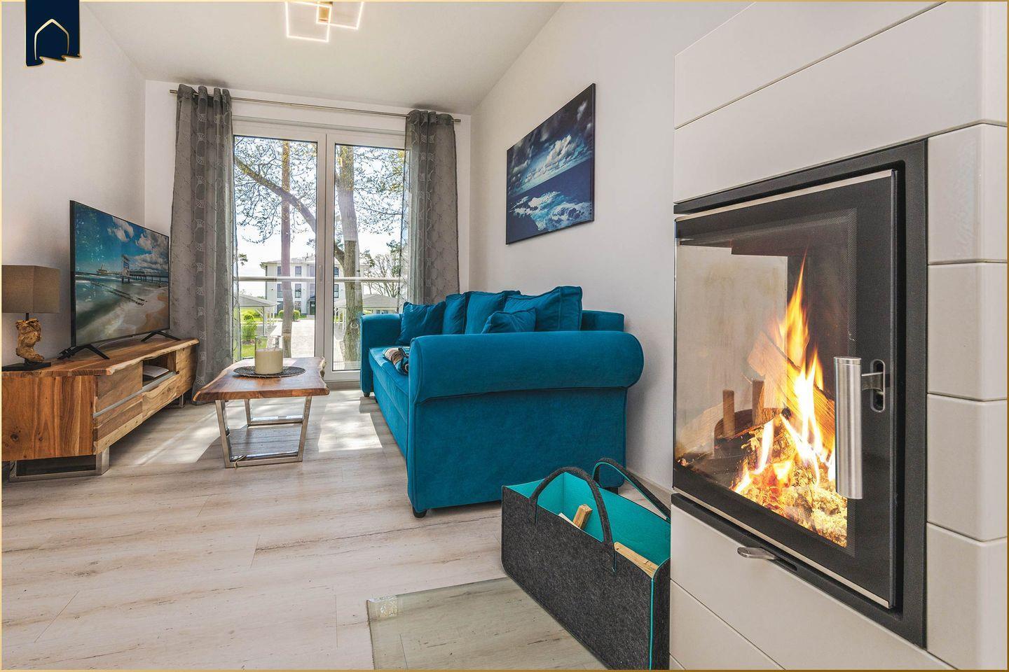 Das geschmackvoll eingerichtete Wohnzimmer mit Sofa, TV und Kamin lädt zu gemütlichen Stunden ein. Die offene Küche ist mit Backofen, Herd, Spülmaschine, Kühlschrank mit Gefrierfach, Toaster, Wasserkocher, Espressomaschine und allen wichtigen Küchenutensilien ausgestattet – perfekt für Selbstversorger. Im Essbereich finden bis zu vier Personen bequem Platz. Das moderne Badezimmer verfügt über eine begehbare Dusche, Waschbecken, WC, Kosmetik- und Ganzkörperspiegel sowie einen Haartrockner. Fußbodenheizung sorgt für angenehme Wärme, selbst an kühleren Tagen.