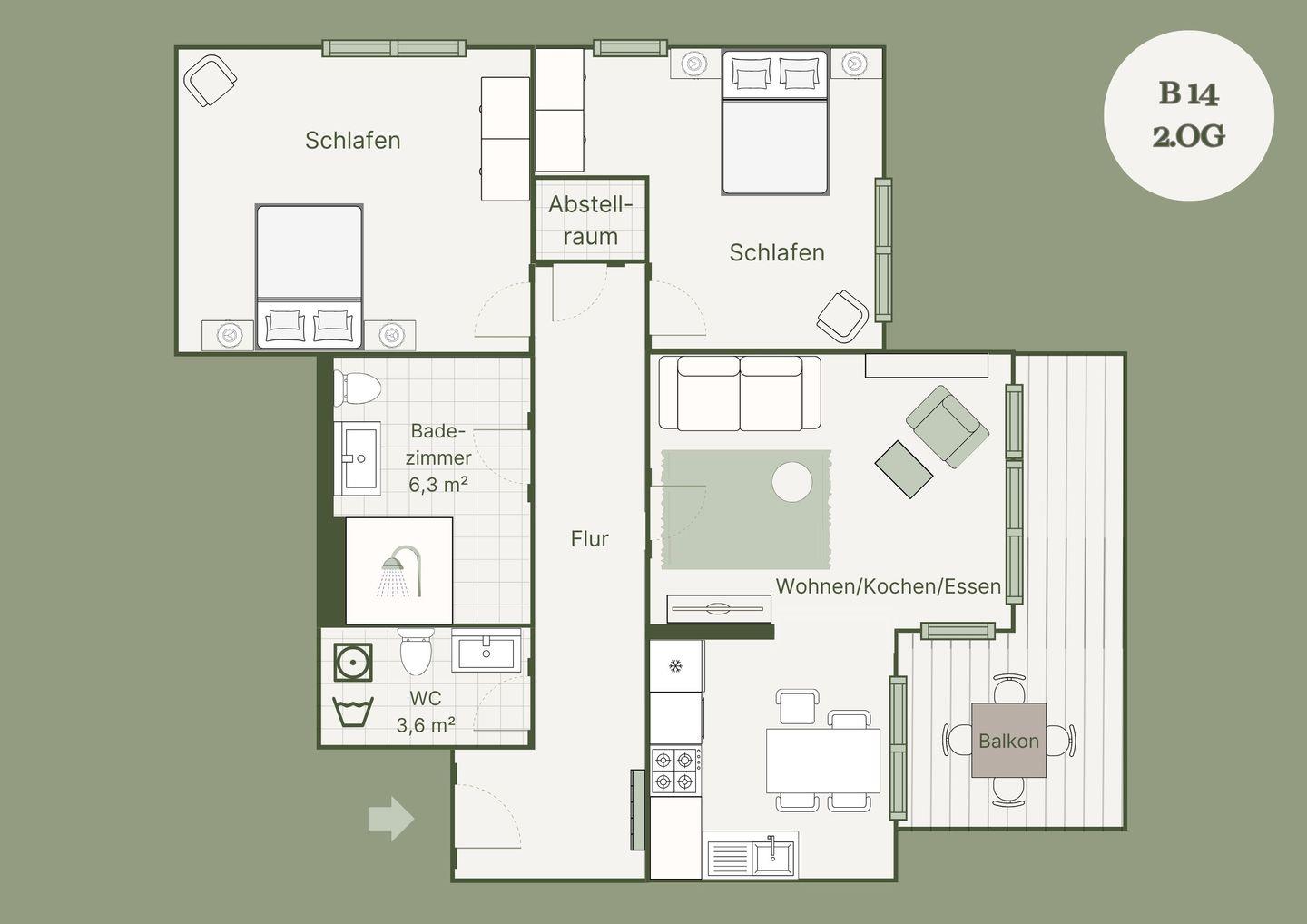 Die 84 m² große Wohnung bietet Platz für bis zu 6 Gäste. Das Wohnzimmer mit Schlafsofa und großen Fenstern lädt zum Entspannen ein. In der voll ausgestatteten Küche lassen sich Köstlichkeiten zubereiten, die Sie auf dem sonnigen Balkon genießen können. Die Schlafzimmer mit komfortablen Doppelbetten sorgen für erholsame Nächte. Zusätzlich gibt es ein Gäste-WC. Das moderne Bad verfügt über eine geräumige Dusche.