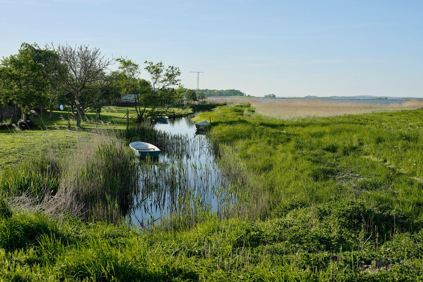 Im oberen Stockwerk befinden sich zwei stilvolle Schlafzimmer mit Doppelbetten und großen Fenstern, die den Blick auf den Wald und das Haff freigeben.