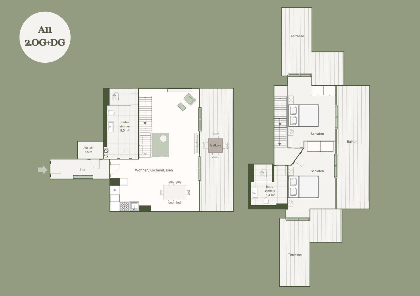 Die großzügige Maisonette-Wohnung A 11 erstreckt sich auf 112 Quadratmetern und bietet Platz für bis zu sechs Personen. Auf zwei Etagen verbindet sie modernes Design mit einer behaglichen Atmosphäre – ideal für Familien oder Freunde.