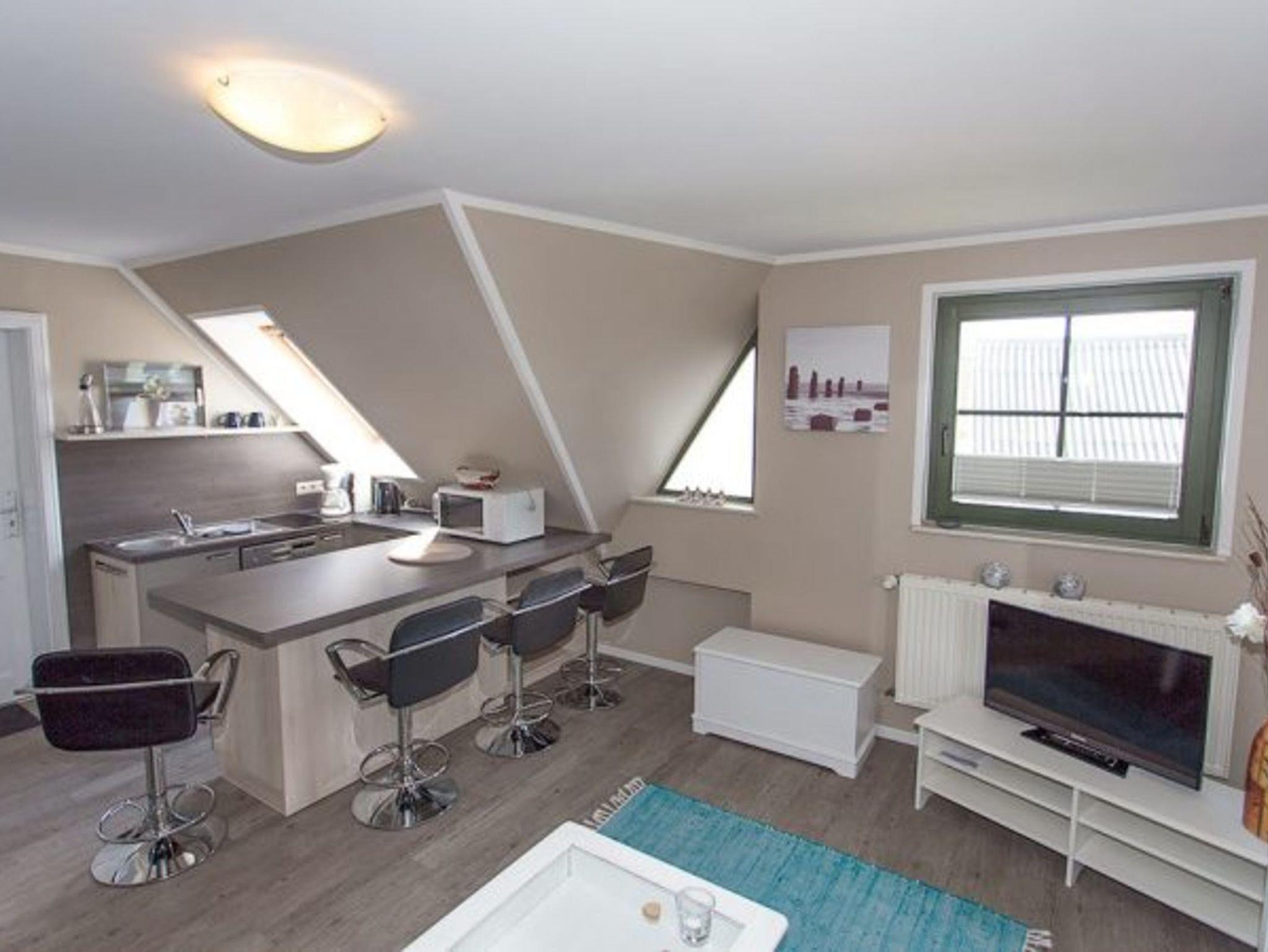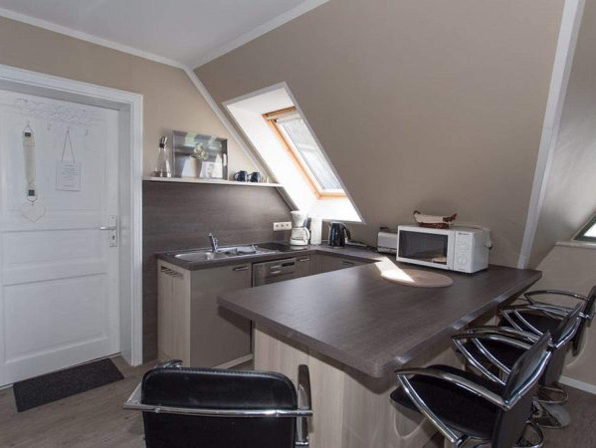 Die ca. 45 m² große Ferienwohnung ist liebevoll und modern eingerichtet und befindet sich im Obergeschoss. Sie verfügt über einen Wohnraum mit Schlafcouch und Tisch, Sat-TV, eine Küchenzeile mit Herd, Geschirrspüler, Mikrowelle, Toaster, Wasserkocher, Kaffeemaschine und Kühlschrank. Die Küche wird durch eine Bar vom Wohnbereich abgetrennt. Die Schlafcouch kann bei Bedarf für zwei Gäste als Aufbettung hergerichtet werden. Ein WLAN-Anschluss ist vorhanden.