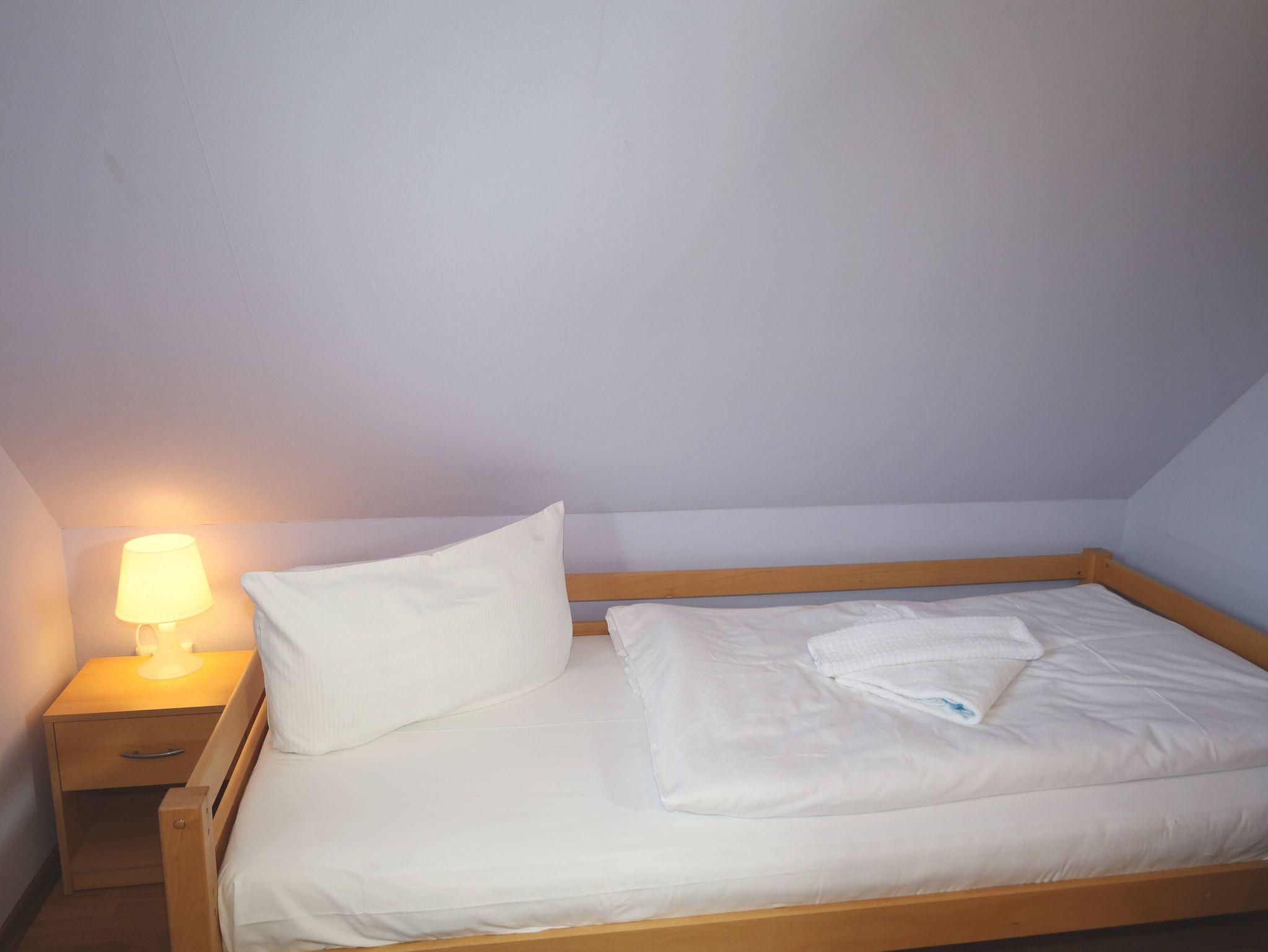 Im Obergeschoss warten weitere gemütliche Rückzugsorte auf Sie: ein Schlafzimmer mit Doppelbett, Kleiderschrank und zusätzlichem Fernseher sowie ein weiteres Schlafzimmer mit Einzelbett.