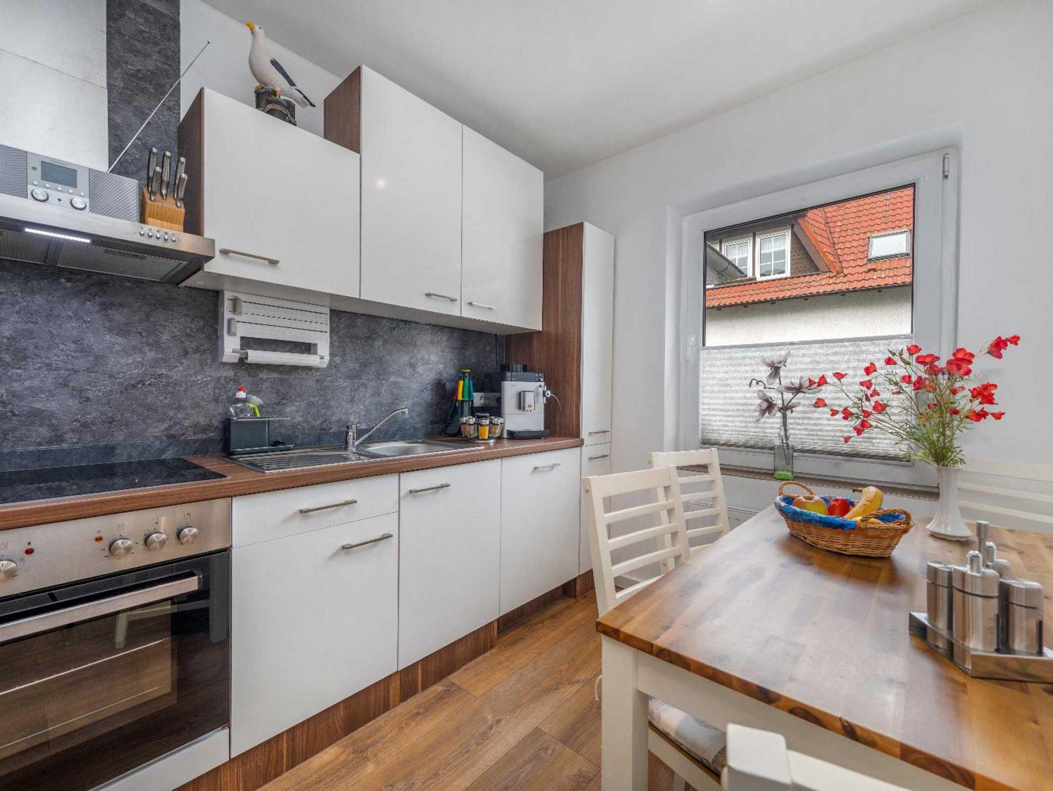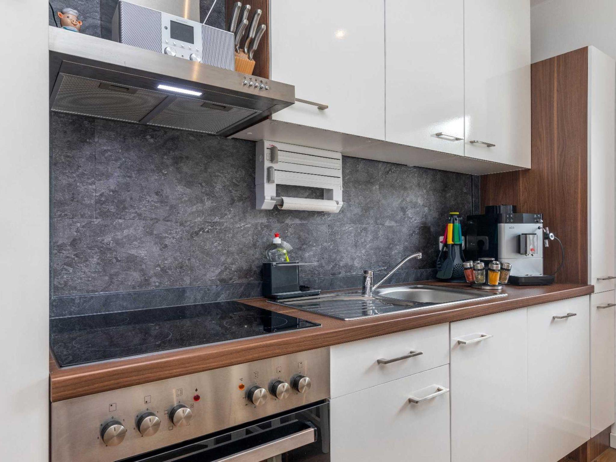 Die separate Küche ist mit Geschirrspüler, Backofen, Ceran-Kochfeld, Kühlschrank mit Gefriermöglichkeit, Mikrowelle und Kaffeemaschine sowie Toaster und Wasserkocher ausgestattet. Waschmaschine, Trockner, Wäscheständer und Wäschespinne stehen ebenfalls zur Verfügung.
