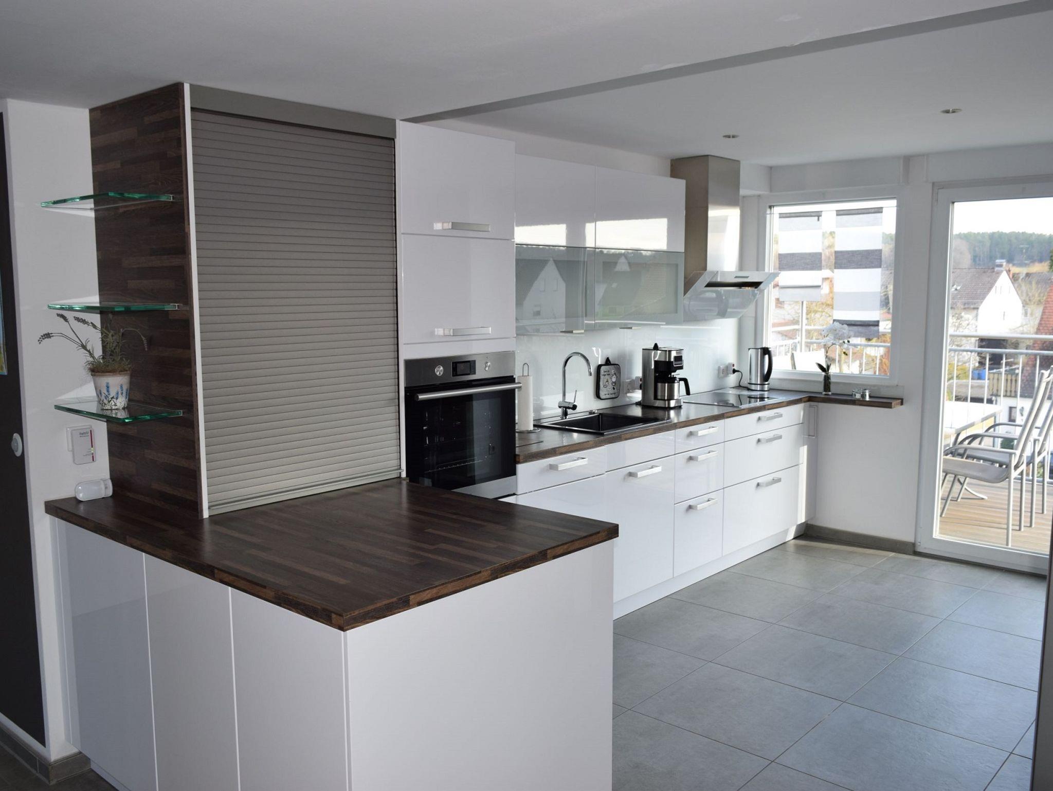 Sie ist komplett mit Spülmaschine, Backofen, Ceran-Kochfeld, Mikrowelle, Kühlschrank mit Gefrierteil
