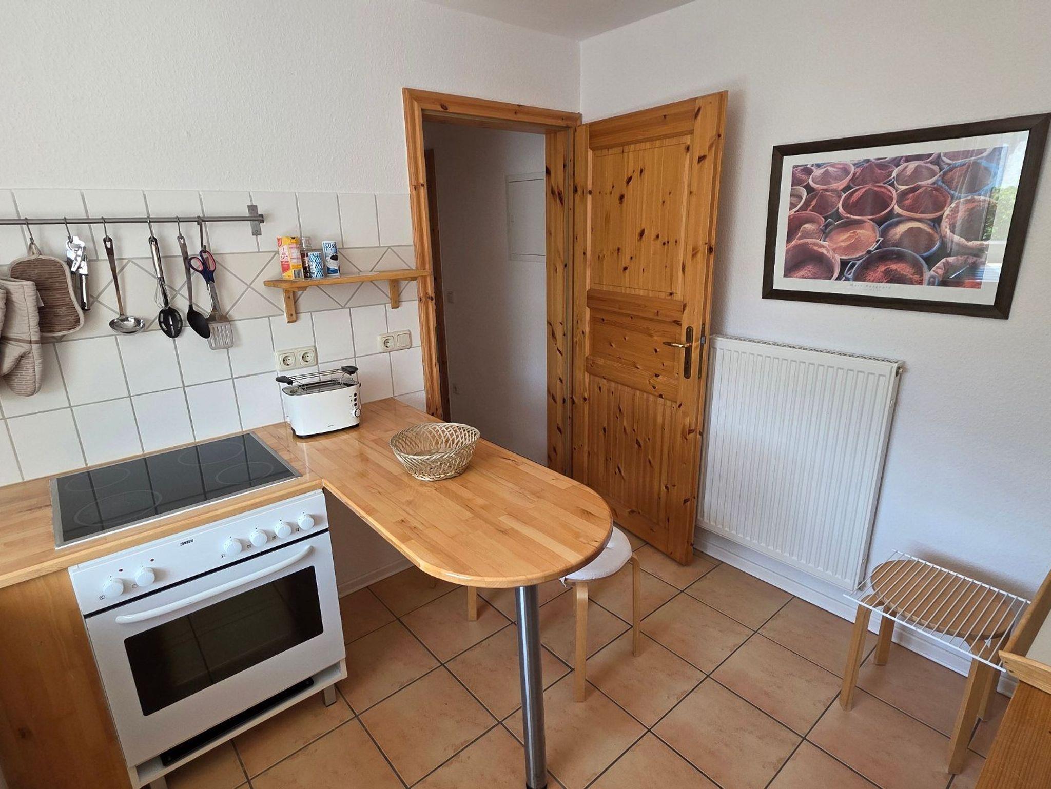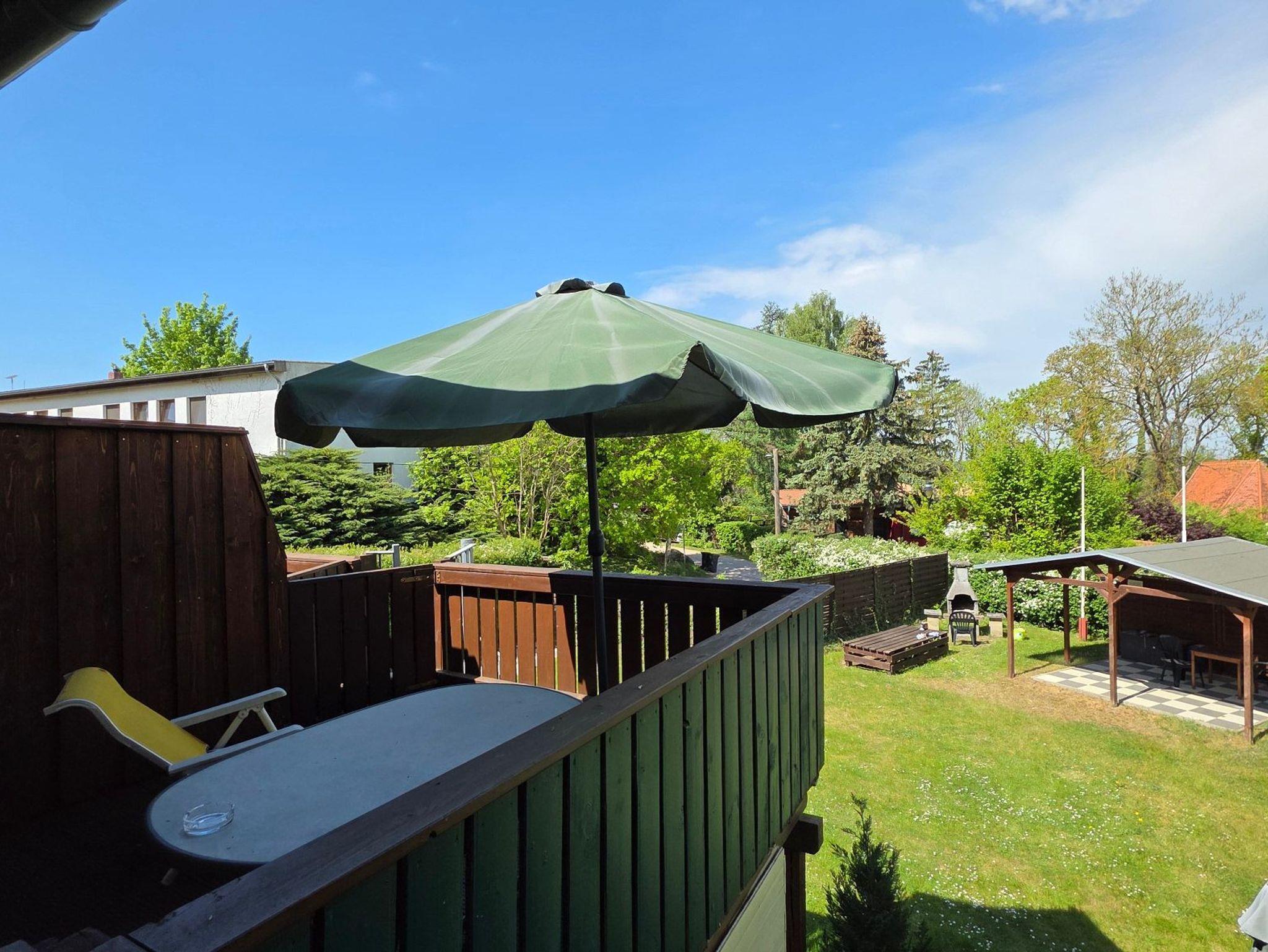 Die Ferienwohnung 4 mit befindet sich in der Ferienanlage Haus am See mit 100 qm auf 2 Etagen (Obergeschoss: Wohnzimmer mit Essplatz, große separate Küche, Gäste-WC mit Dusche, Dachgeschoss: 2 Schlafzimmer mit Doppelbett, 1 Schlafzimmer mit 2 Einzelbetten, Bad/Wanne/WC, ). Aus dem Wohnzimmer gelangt man direkt auf den großen Südwest-Balkon. Vom Balkon gelangt man über eine Spindeltreppe in den Garten.