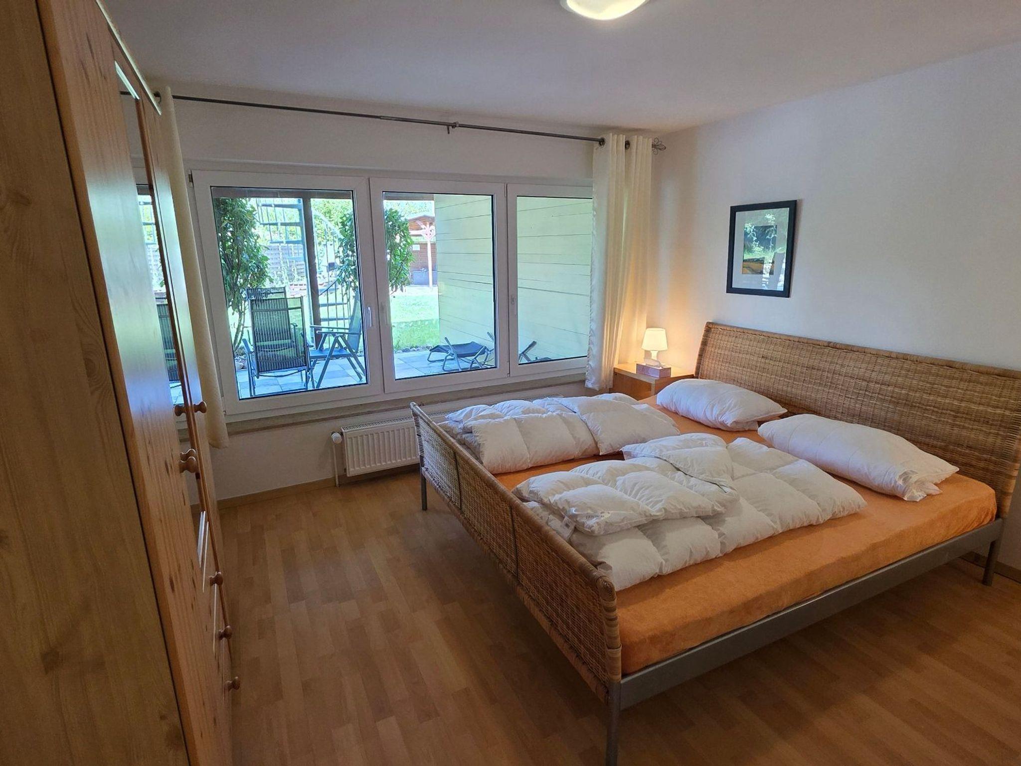 Die Ferienwohnung 2 befindet sich im Erdgeschoss in der Ferienanlage Haus am See mit 69 qm (Schlafzimmer mit Doppelbett, Küche mit Essplatz, Wohnzimmer mit Schlafcouch für 2 Personen). Aus dem Wohnzimmer gelangt man direkt auf die grosse Südwest-Terrasse und in den Garten.