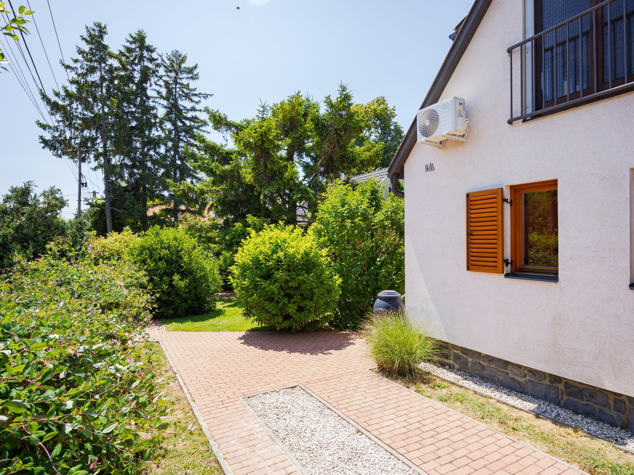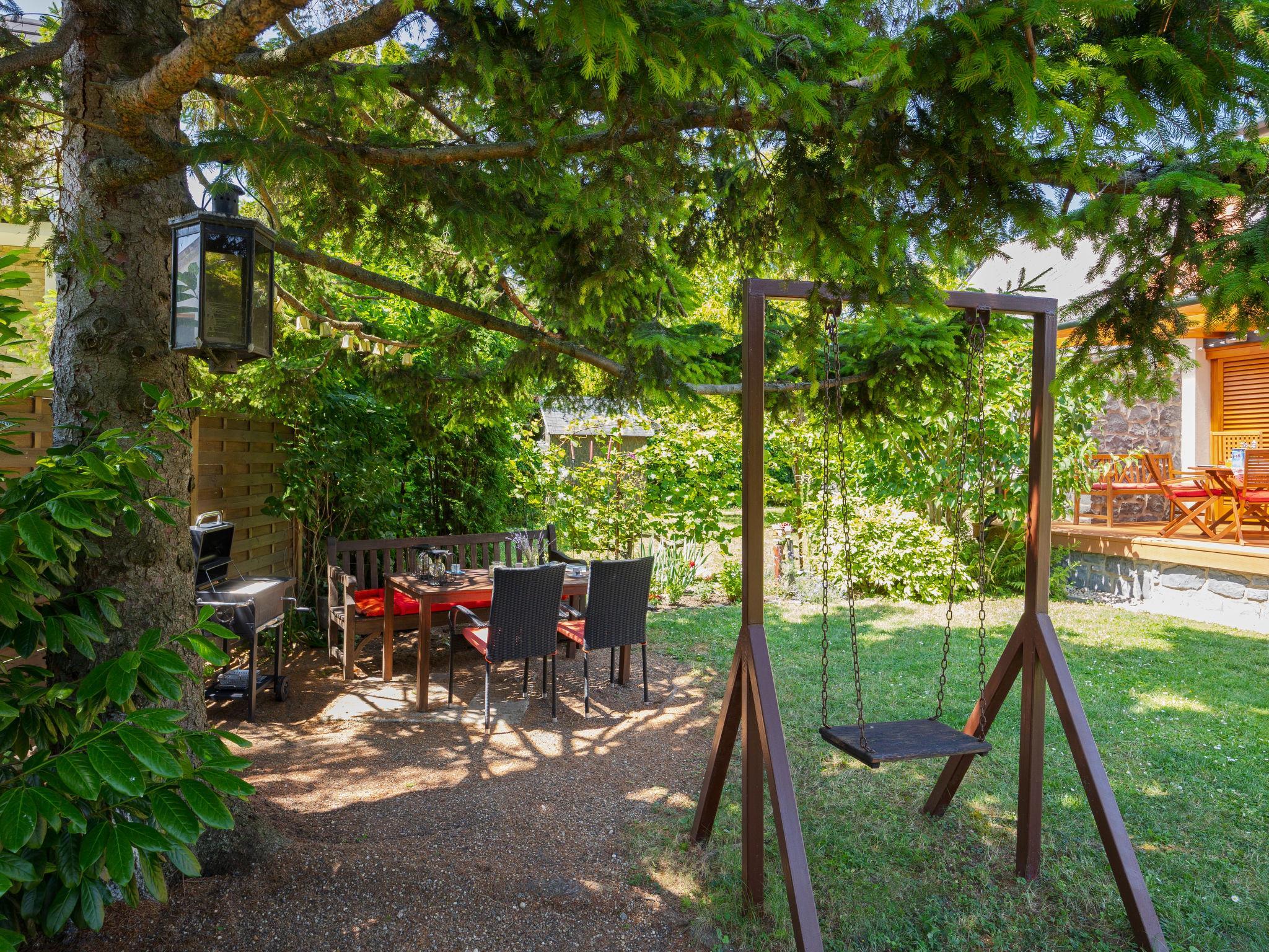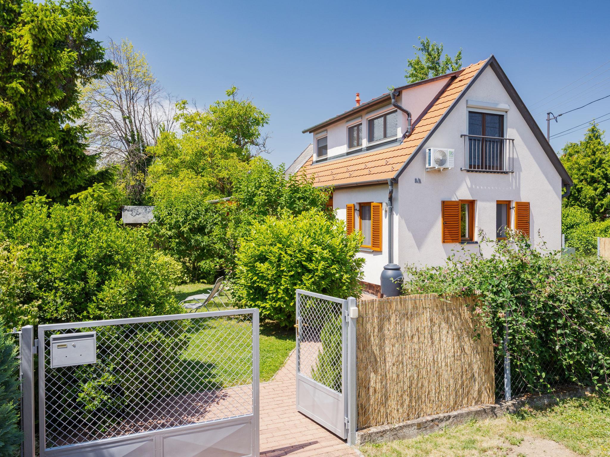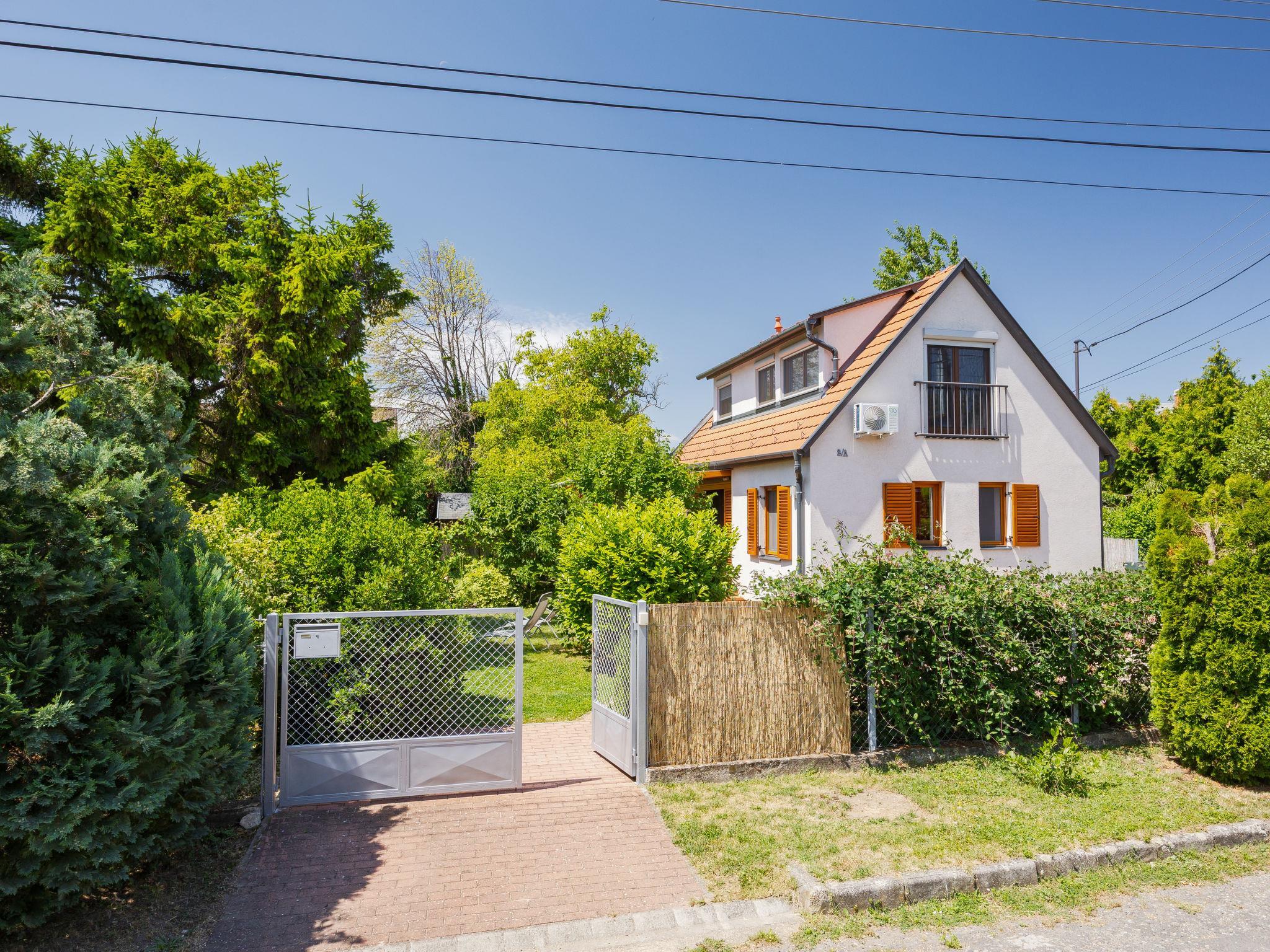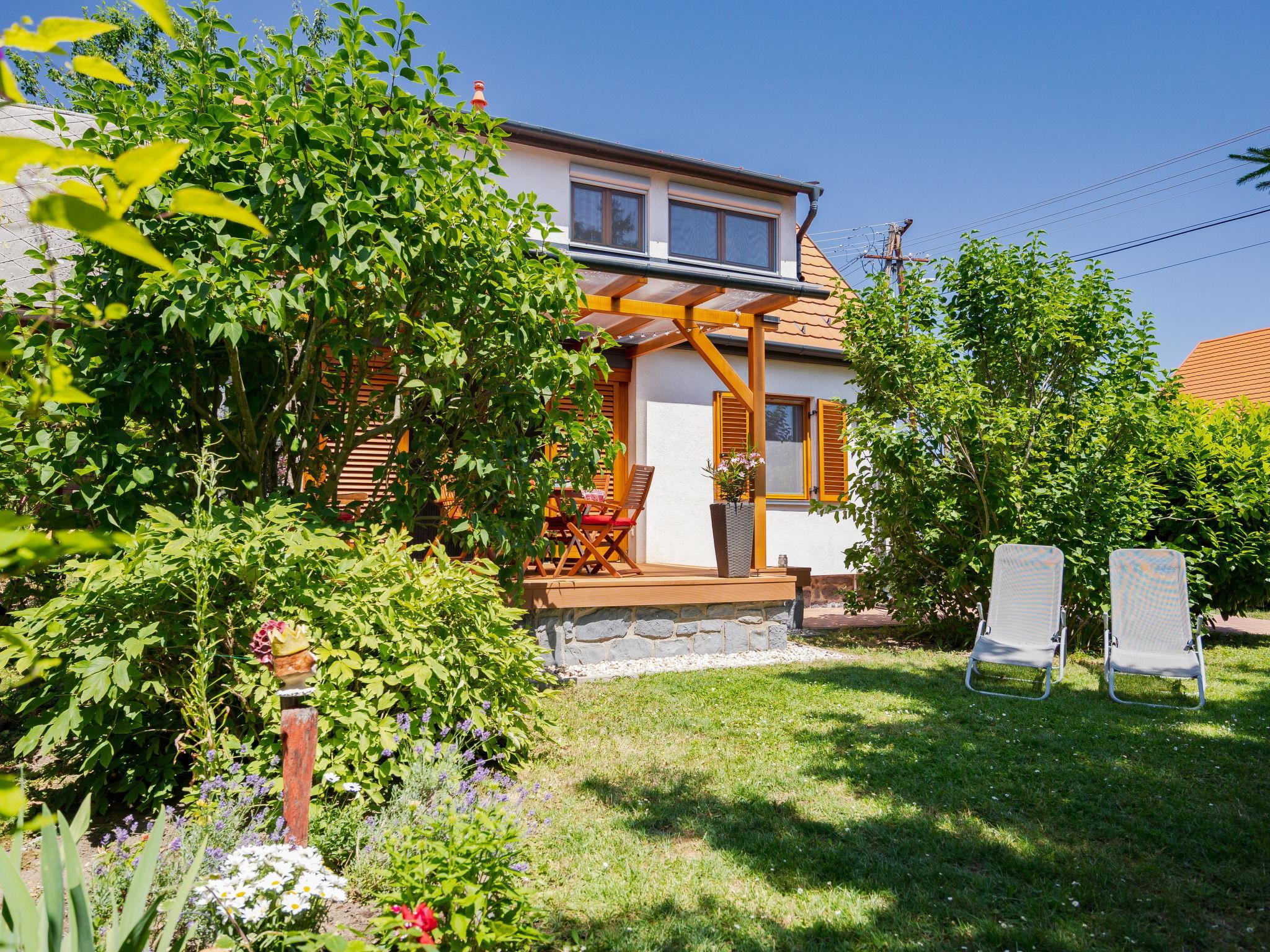Balatonakali 15 km from Balatonfüred: Cosy, comfortable semi-detached house "Clarissa", 2 storeys. In the resort, 200 m from the lake, 1 km from the beach. Private: property (fenced), garden (not fenced) flowers and trees. (swing). In the house: WiFi, central heating system, air conditioning, washing machine. Parking on the premises. Supermarket 550 m, restaurant 280 m, bakery, café 550 m, bicycle rental 900 m, bus stop "Balatonakali, bejárati út" 400 m, railway station "Balatonakali-Dörgicse" 650 m, thermal baths "Hévíz" 52 km. Marina 400 m, golf course (18 hole) 6 km, tennis 4 km, indoor tennis centre 14 km, riding stable 15 km, sports centre 14 km, cycle lane 50 m, children's playground 350 m. Nearby attractions: Balatonudvari Golf Club 60 km, Tihany templom 13 km, Balatonfüred Annagora Aquapark 14 km, Badacsony 25 km, Folly Arboretum 20 km, Veszprém Zoo 40 km. Please note: baby equipment on request (included). The owner does not accept any youth groups. The keys‘ handover takes place by the agency Interhome in Balatonfüred, 15 km. Railway line closeby 100 m from the property.